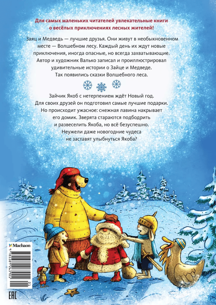 Hare and Bear are best friends. They live in an extraordinary place - the Magic Forest. Every day they are waiting for new adventures, sometimes dangerous, but always exciting. The author and artist Valko recorded and illustrated amazing stories about the Hare and the Bear. This is how the tales of the Magic Forest came to be. Jakob the Hare is looking forward to the New Year, the favorite holiday of all the inhabitants of the Magic Forest. For his friends, the Hare and the Bear, he has prepared the best gift of all - their grand portrait. But a terrible thing happens: a snow avalanche hits his house and destroys the picture. The animals try to cheer up and cheer up Jacob, but all to no avail. Will not even New Year's miracles make Jakob smile?