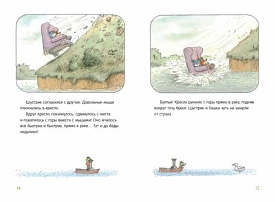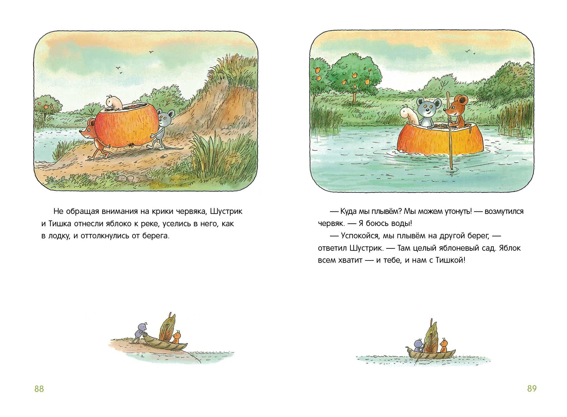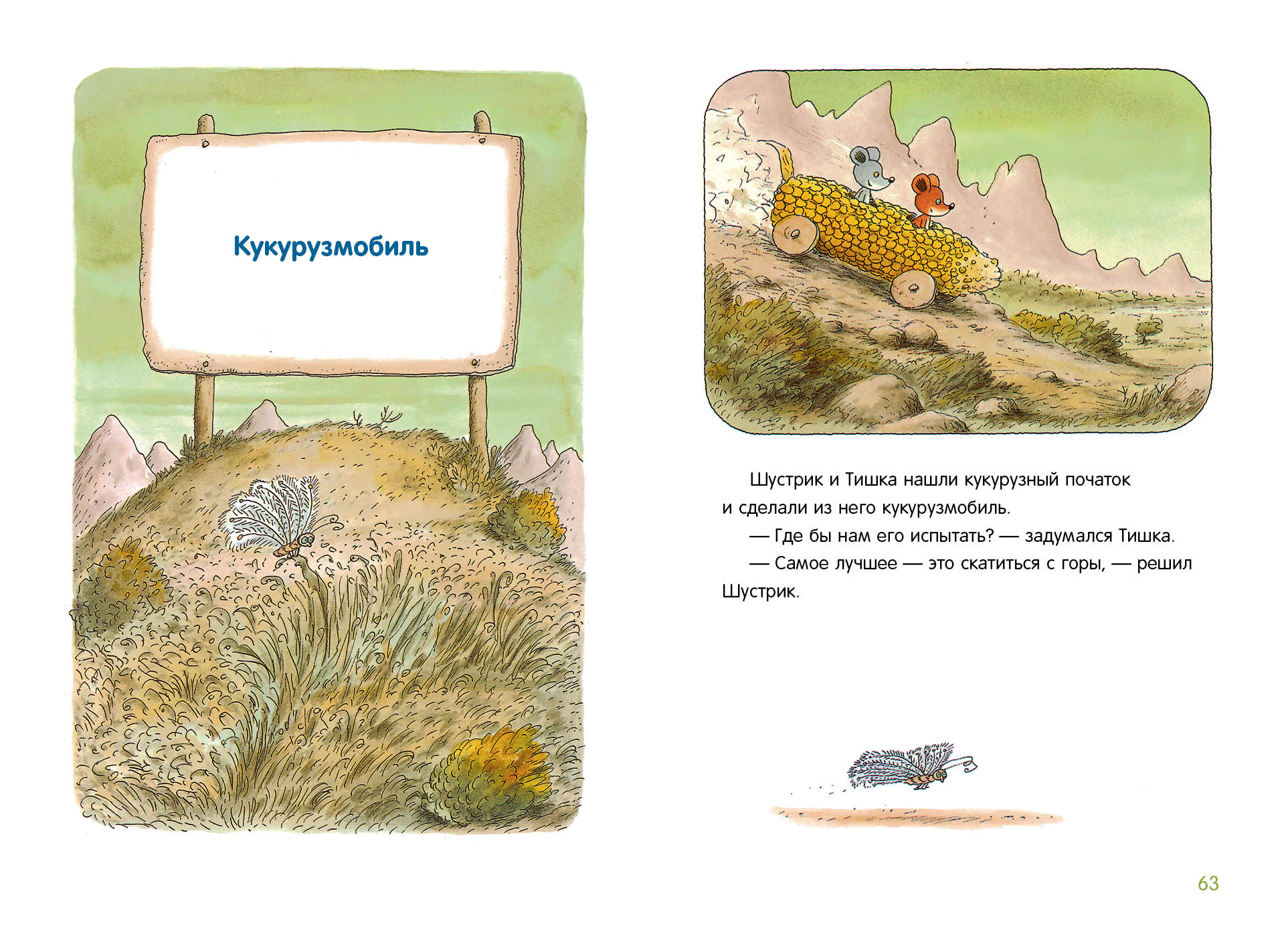 The heroes of the first book by Erwin Moser, the restless, resourceful inventor Shustrik and the cautious, polite Tishka, were so beloved by children that the second book about their new adventures was born. Every day the friends are filled with interesting things to do. They turn a turtle into an island, make a cornmobile from a cob, get into a snowstorm, save a thistle bush. There is no end to the ingenious mice's inventions: they hang an old shoe from a balloon to replace a collapsed basket, make a rocking bed using planks from an old barrel, and use a collapsed hut for firewood. Simple text and clear pictures are on the same page - the child listens and looks at the story at the same time. Short, unconnected tales by the famous Austrian children's author and illustrator Erwin Moser will be of interest to very young children from the age of two.