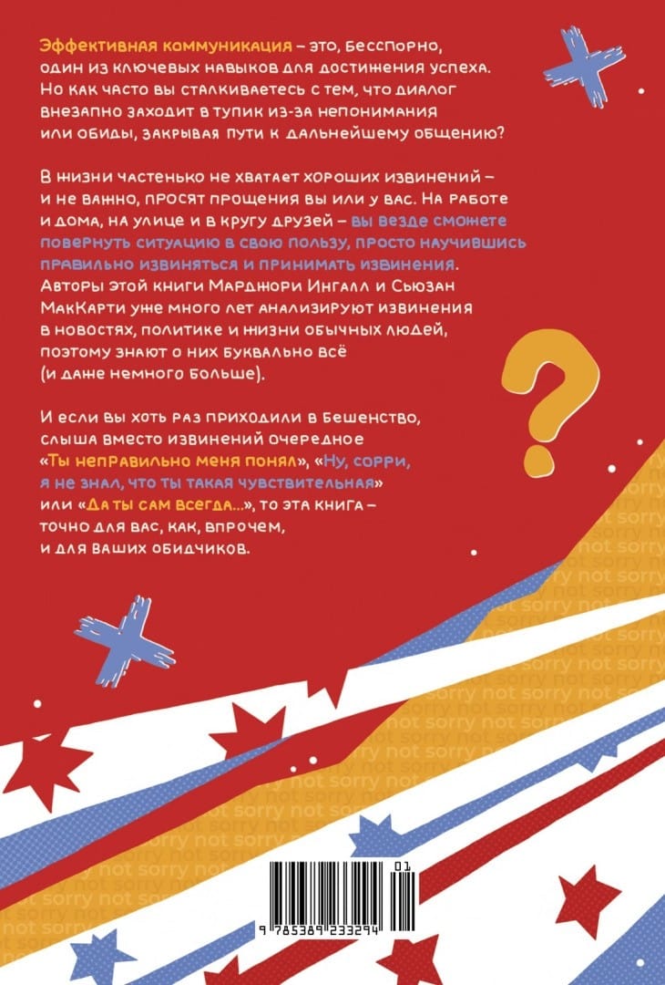 Effective communication is undoubtedly one of the key skills for success. But how often do you find that a dialog suddenly comes to a standstill because of misunderstanding or resentment, closing the way to further communication? A good apology is often in short supply in life - and it doesn't matter whether you or you are the one being apologized to. At work and at home, on the street and in the circle of friends - you can turn the situation in your favor, simply by learning how to properly apologize and accept apologies. The authors of this book, Marjorie Ingall and Susan McCarthy, have been analyzing apologies in the news, politics, and the lives of ordinary people for years, so they know literally everything (and a little more) about them. And if you've ever been furious when you hear, instead of an apology, another "You misunderstood me," "Well, I'm sorry, I didn't know you were so sensitive," or "You're always..." then this book is for you, as well as for your abusers.