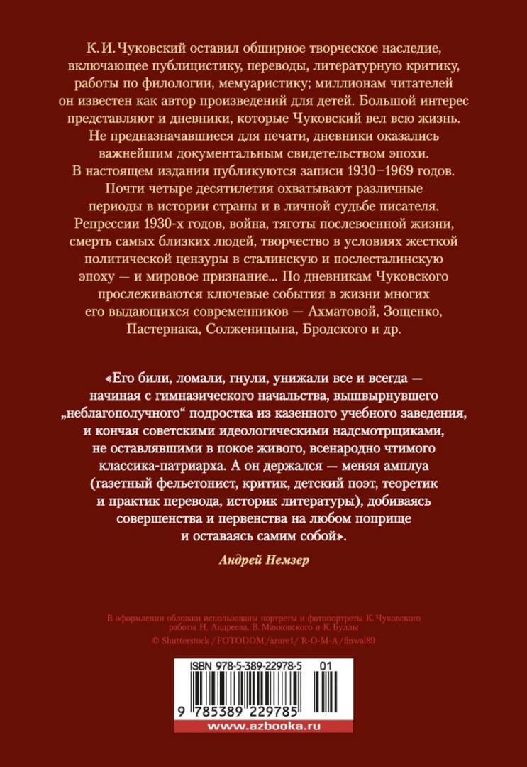 K. I. Chukovsky left an extensive creative legacy, including journalism, translations, literary criticism, works on philology, memoirs; millions of readers know him as an author of works for children. Of great interest are the diaries that Chukovsky kept all his life. This publication publishes the records of 1930-1969. Almost four decades cover different periods in the history of the country and in the personal fate of the writer. The repressions of the 1930s, the war, the hardships of post-war life, the death of the closest people, creativity in the conditions of severe political censorship in the Stalin and post-Stalin era – and world recognition. Chukovsky’s diaries trace key events in the life of many of his outstanding contemporaries – Akhmatova, Zoshchenko, Pasternak, Solzhenitsyn, Brodsky and others.