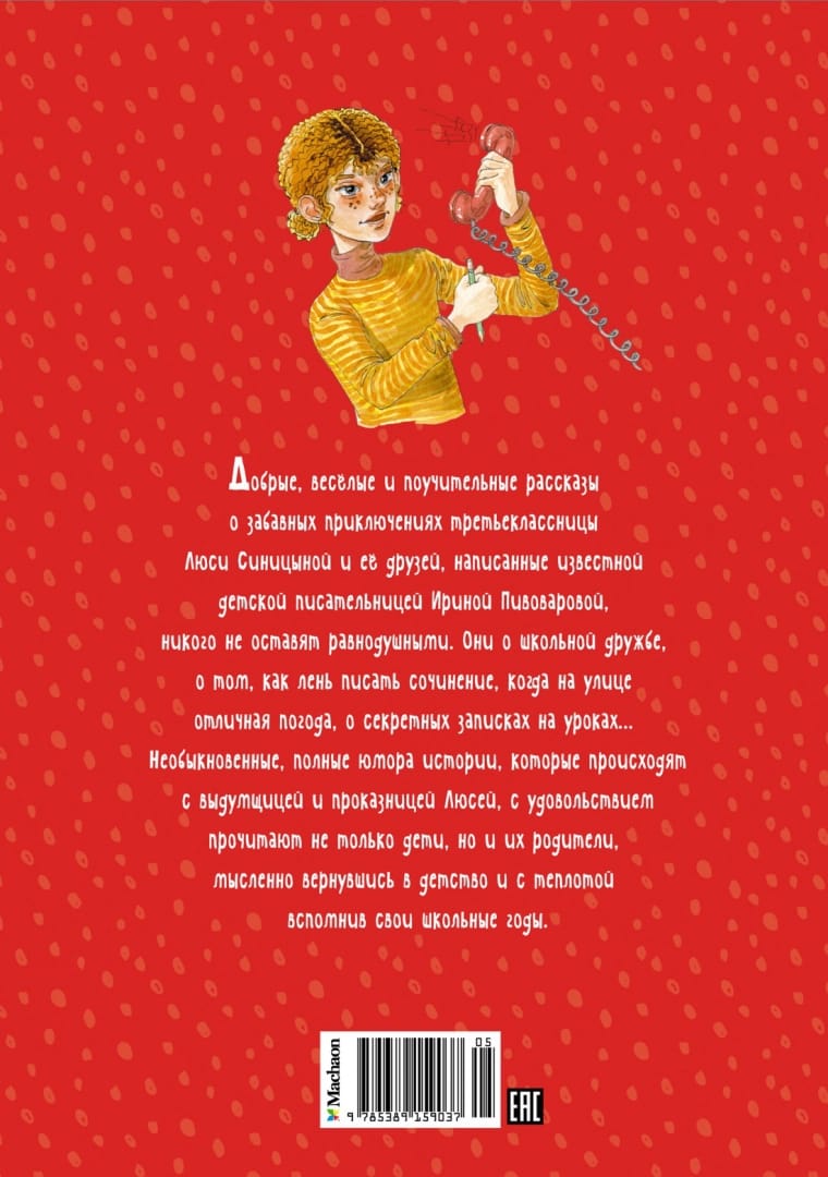 Kind, funny and instructive stories about the funny adventures of third-grader Lucy Sinitsina and her friends, written by the famous children's writer Irina Pivovarova, will not leave anyone indifferent. They are about school friendship, about how lazy it is to write an essay when the weather is great outside, about secret notes on lessons.... Unusual, full of humor stories that happen to the imaginative and mischievous Lyusya, will be read with pleasure not only by children, but also by their parents, mentally returning to childhood and warmly remembering their school years.