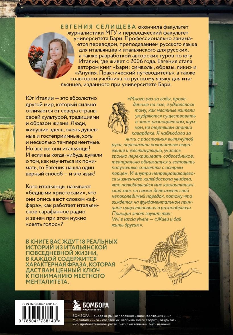 Real stories with a taste of the Italian sun. The south of Italy is a completely different world, which is very different from the north of the country in its culture, traditions and lifestyle. The people who live here are very warm-hearted and hospitable, though somewhat temperamental. But they are Italians nonetheless! And if you have ever thought about how to learn to understand them, the author Eugenia Selischeva, who has been living here since 2006, has found one sure way - and that is language! After all, it is the most complete reflection of the culture of any nation. Who do Italians call "poor Christos", what do they describe with the word affare, how does Italian word of mouth work and why do you need to "sow your voice"? Immerse yourself in the flavor of the local culture with non-fictional stories about the inhabitants of a typical southern town! And find answers to your questions about these temperamental Italians.
