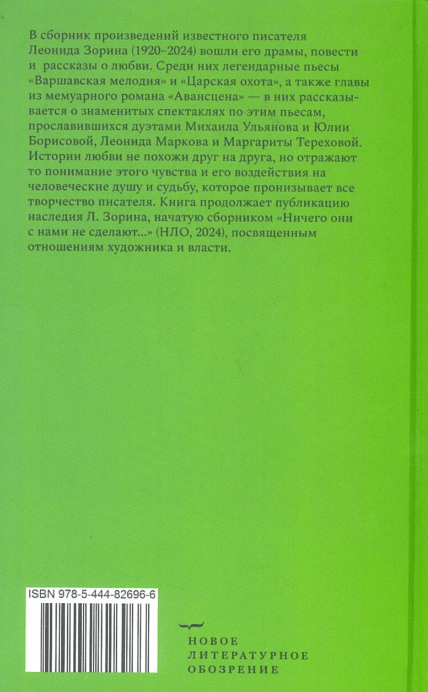 This collection of works by renowned writer Leonid Zorin (1924–2020) includes his dramas, novellas, and short stories about love. Among them are the legendary plays "Warsaw Melody" and "The Tsar's Hunt," as well as chapters from his memoir novel "Center Stage," which recount the celebrated performances of these plays, made famous by the duets of Mikhail Ulyanov and Yulia Borisova, and Leonid Markov and Margarita Terekhova. While the love stories are distinct, they reflect an understanding of this feeling and its impact on the human soul and destiny that permeates the writer's entire work. This book continues the publication of Zorin's legacy, begun with the collection "They Won't Do Anything to Us..." (NLO, 2024), dedicated to the relationship between the artist and the authorities.