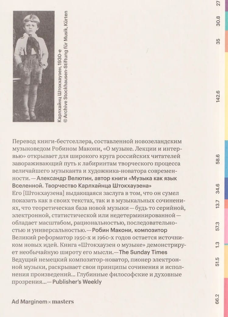 One of the most influential contemporary composers, Karlheinz Stockhausen (1928-2007) pioneered electronic, multi-orchestral, and meditative music. His work is the quintessence of the achievements of 20th- and early 21st-century musical art and a historical summary of the evolution of world musical culture in its classical sense. We can trace the development of Stockhausen's thought and hear his living voice thanks to Robin Maconie, a New Zealand composer, pianist, and musicologist who has transcribed lectures and interviews with the German genius. Despite his critical eye, Maconie conveys in this book the love and respect he had for Stockhausen, with whom he personally interacted and worked. It is through this friendly perspective that the reader will be able to navigate the labyrinth of the creative process of this greatest innovative musician and see the real Stockhausen, with his strengths, flaws, foibles, and insights—a living, breathing man, a man of our time.