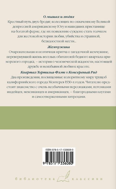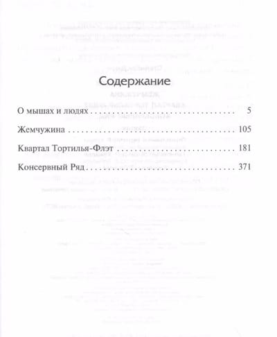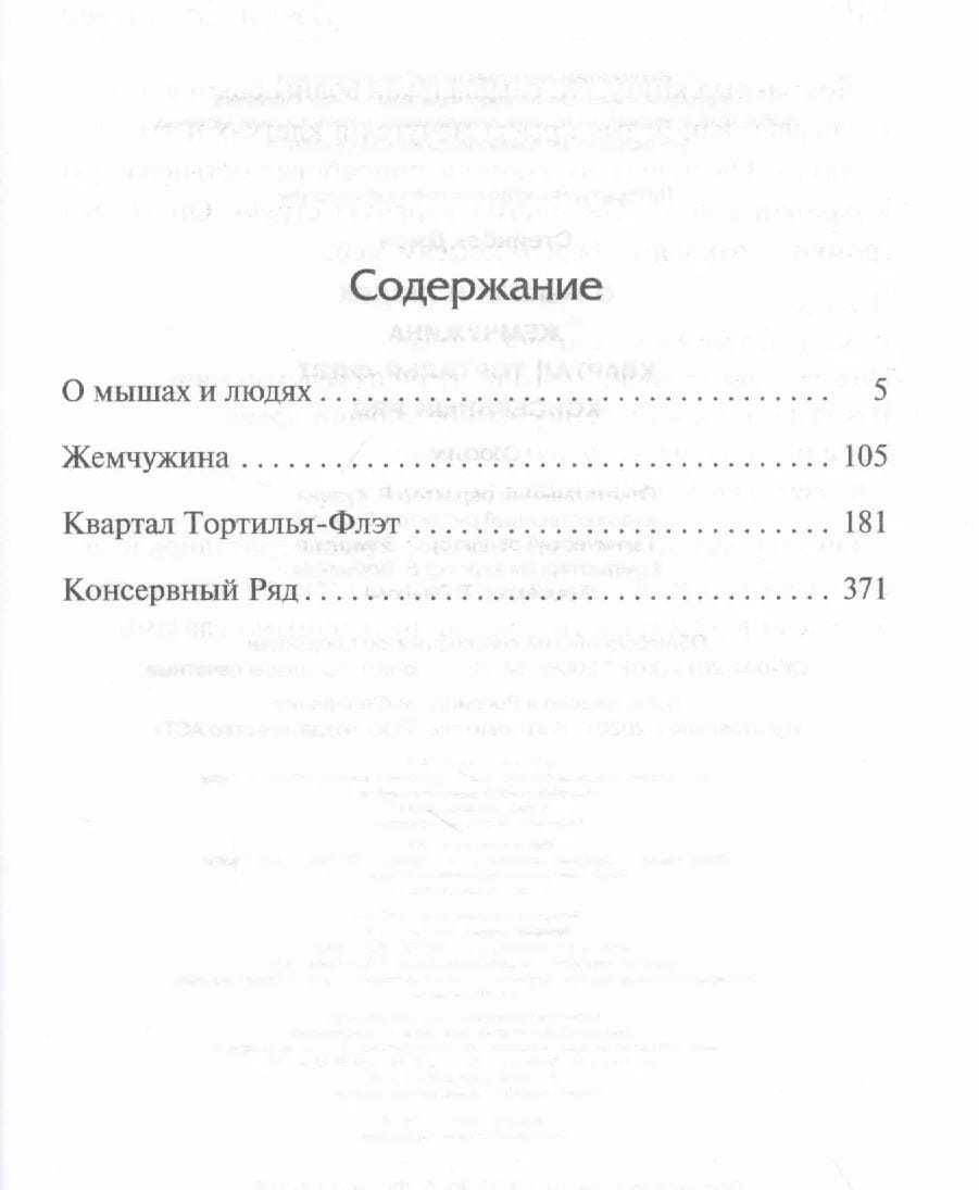"Tortilla Flat" and "Cannery Row" are two works dedicated to the colorful world of the slums of the Californian city of Monterey in the 1930s. The reader will get acquainted with very unusual characters, descendants of Indians, Mexicans and Americans - noble rogues and selfless sly men.