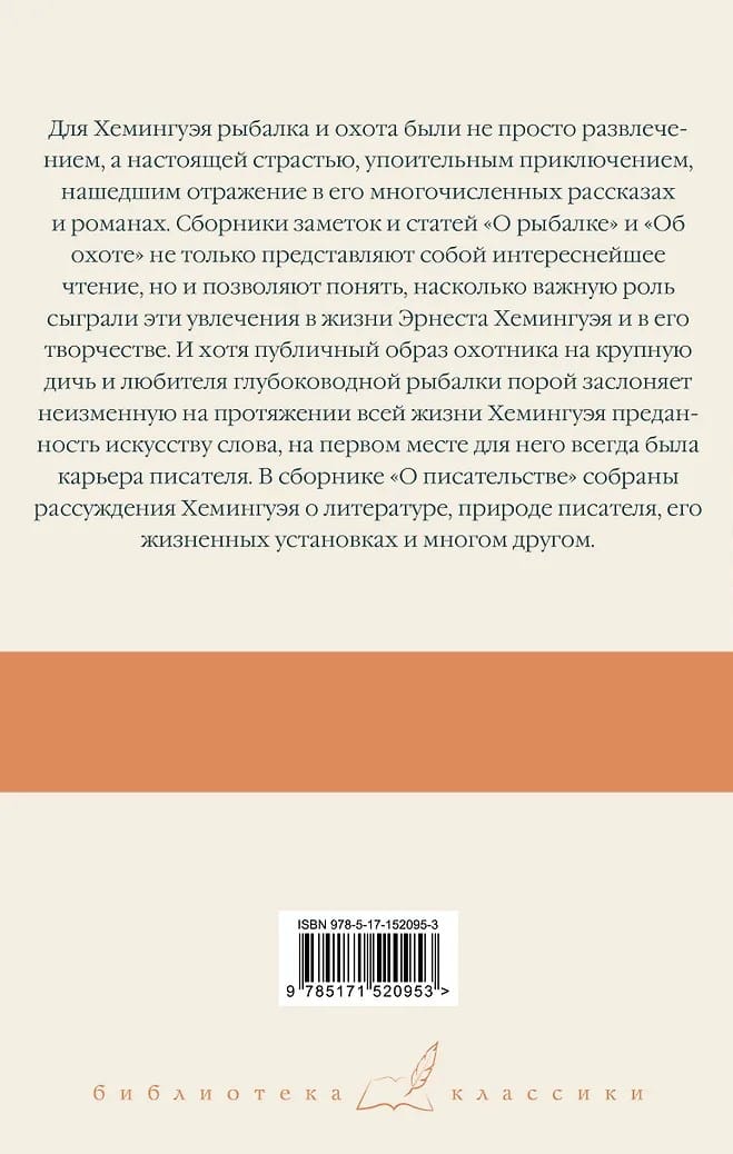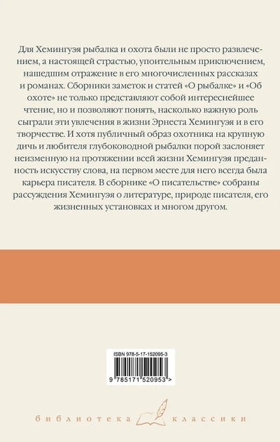 For Hemingway, fishing and hunting were more than just a pastime; they were a true passion, a thrilling adventure reflected in his numerous short stories and novels. The collections of notes and articles, "On Fishing" and "On Hunting," not only make fascinating reading but also offer insight into the important role these passions played in Ernest Hemingway's life and work. Although his public persona as a big-game hunter and deep-sea fisherman sometimes obscures his lifelong devotion to the written word, his writing career always came first. "On Writing" contains Hemingway's reflections on literature, the nature of the writer, his life philosophy, and much more.
