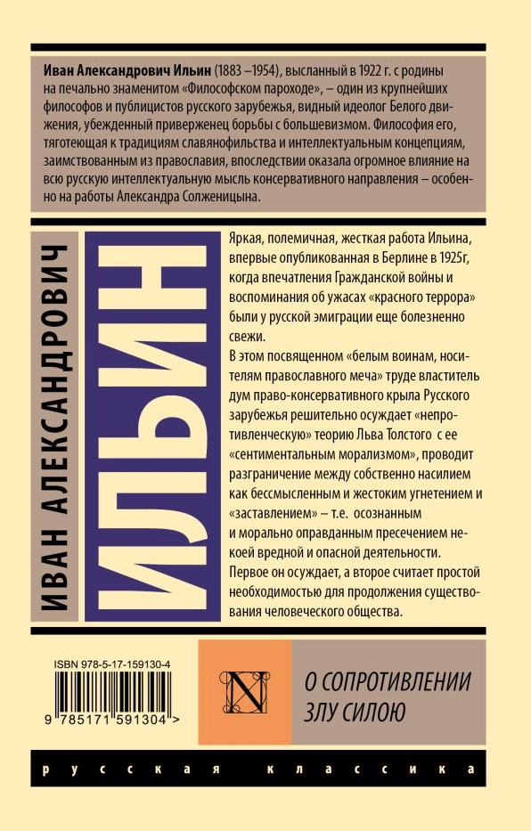In this work dedicated to "white soldiers, bearers of the Orthodox sword," the ruler of the minds of the right-conservative wing of the Russian Diaspora strongly condemns Leo Tolstoy's "non-resistance" theory with its "sentimental moralism" and distinguishes between violence itself as senseless and cruel oppression and "compulsion," i.e., the conscious and morally justified suppression of some harmful and dangerous activity. He condemns the former and considers the latter a mere necessity for the continued existence of human society.