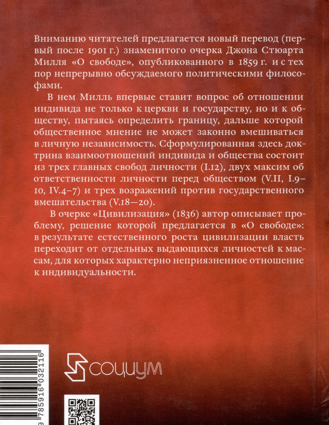 In it, Mill first raises the question of the individual's relationship not only to church and state, but also to society, trying to determine the limit beyond which public opinion cannot legitimately interfere with personal independence. The doctrine of the relationship of the individual to society formulated here consists of three main personal liberties (I. 12), two maxims on the individual's responsibility to society (V. II, I. 9-10, IV. 4-7) and three objections to government intervention (V. 18-20).