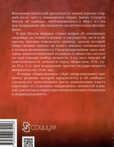 The reader is offered a new translation (the first since 1901) of John Stuart Mill's famous essay "On Liberty", published in 1859 and continuously discussed by political philosophers since then.