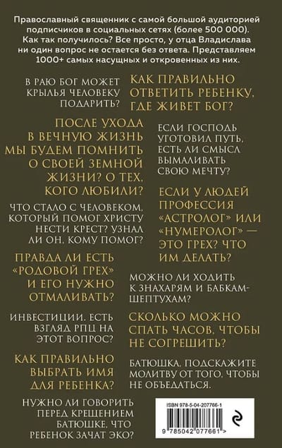 Many of us — both those who have long been part of the Church and those who are just taking their first steps towards it — are invariably concerned with a variety of questions, from rather funny to very serious. Therefore, the opportunity to receive a clear and precise answer in the very near future, especially from an author whom we love and respect, always becomes incredibly valuable, since it allows us to save our energy and time and direct them to good deeds. This is the goal of the new book by priest Vladislav Beregovoy, compiled in a question-answer format, based on the author’s many years of communication with parishioners and subscribers. Conversations about God and His will, about life and death, about sins and virtues, about angels and demons, about Holy Scripture, about the Church and the sacraments of the Church, about relationships and feelings, about growing in faith and much more - the range of topics that the book is intended to touch on is unusually wide, thanks to which the chance of finding an answer to a long-troubling question, whatever it may be, increases many times over.