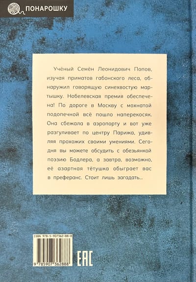 Attention! Wanted blue-tailed monkey! Special features: speaks French, rides a bicycle, has a talent for journalism and organizational skills, knows the poems of Rimbaud, Baudelaire and Verlaine, and also composes quite well. and also trained in social manners.... The monkey was spotted at Charles de Gaulle airport and then in the center of Paris. But the townspeople seem happy to see it. What's a monkey? They've seen it before. But it seems that the new capital's new girl is in danger. A banana warehouse has been robbed and there's only one suspect - Her Royal Highness. What will the court and the public say? Will the monkey be able to prove that it is not her handiwork?