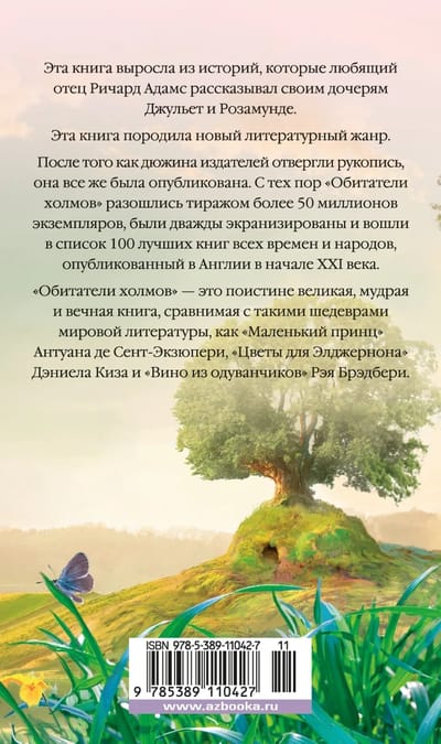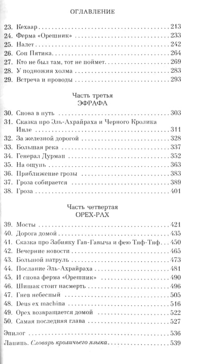 "Watership Down" is the story of reluctant adventurers forced to leave their crumbling town and embark on a long, perilous journey. And none of them knows where it will end. The heroes of Adams's novel have their own mythology, language, customs, and way of life. They tell each other stories and dig underground shelters. But they are rabbits, not humans, transformed into animals by the author's imagination. This amazing novel is capable of captivating the hearts of not only adults but also children. "Watership Down" is one of the best books written in the 20th century, taking its rightful place alongside "The Little Prince" by Antoine de Saint-Exupéry, "Jonathan Livingston Seagull" by Richard Bach, "Dandelion Wine" by Robert Bradbury, and "Flowers for Algernon" by David Keyes. The novel is published in a revised and expanded version.