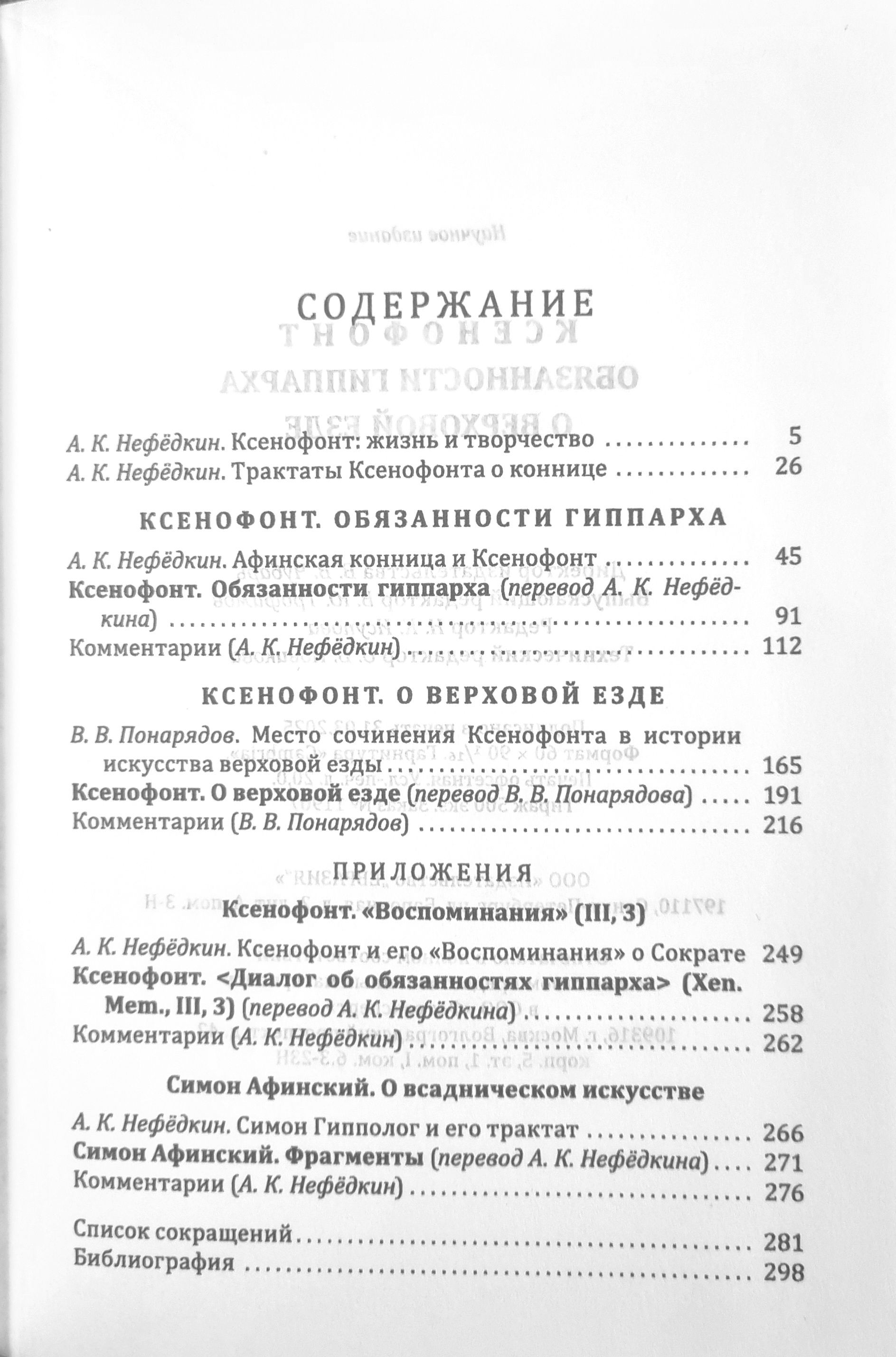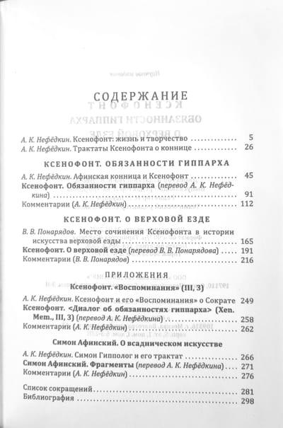 As an appendix to the book, the first translation into Russian of all surviving fragments of the Athenian author of the turn of the 5th-4th centuries BC Simon Hippologus "On the Equestrian Art" ("On Horseback Riding") is given - the first to write a special treatise on this topic.