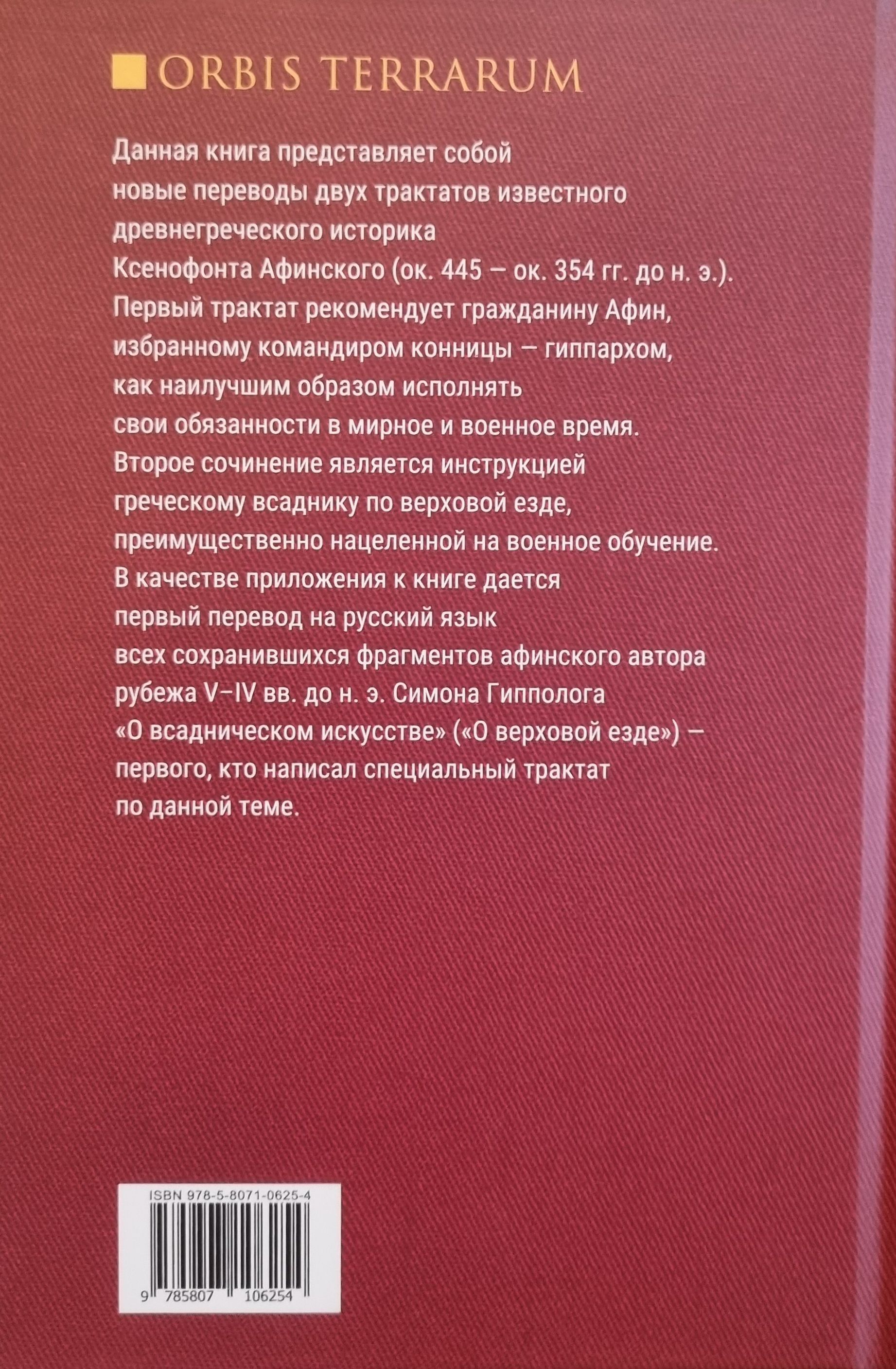 This book is a new translation of two treatises by the famous ancient Greek historian Xenophon of Athens (c. 445 - c. 354 BC). The first treatise recommends to a citizen of Athens, elected as a cavalry commander - a hipparch, how best to perform his duties in peacetime and wartime. The second work is an instruction for a Greek horseman on horseback riding, primarily aimed at military training.