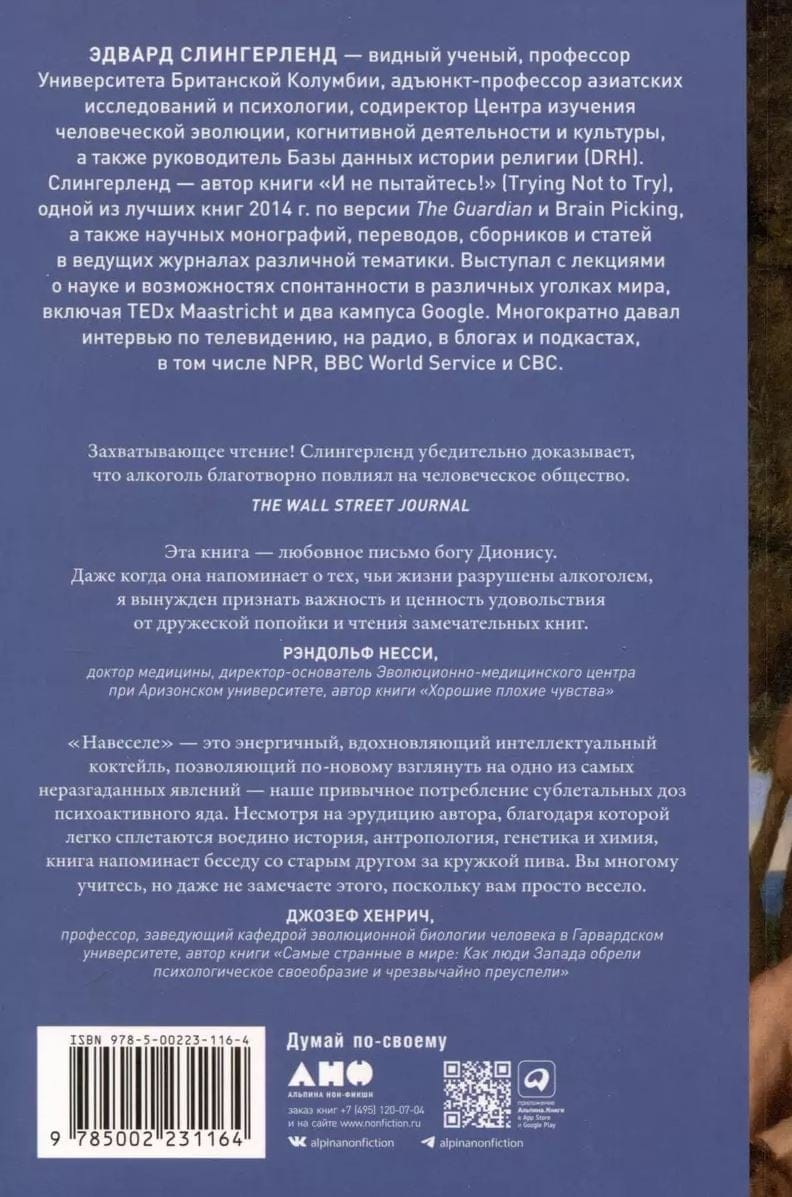 The author of the book, the famous cognitive psychologist Edward Slingerland, proposes to look at familiar things in a new way. Pleasures and pleasures, in his opinion, should be considered from the point of view of evolutionary necessity. Having accumulated a lot of interesting material on the history of alcohol, the scientist draws a comprehensive picture of the relationship between humans and intoxicating substances.
