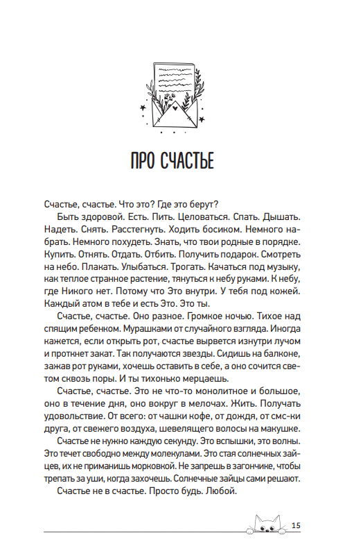 It is like a compress: put it on your head, and slowly all the pain will go away. It's like a scarf, long and long and warm and warm. Wrap yourself in it with your head, make a cozy cocoon, survive the difficult days in it. Stay in the cocoon as long as you need. Remember that everything passes, scars heal, black blizzards subside. She's like a flipping pancake. Blow on it, dip it in honey, and savor it. There's a lot of delicious things ahead. And very HEAVY, this flapjack won't lay on your ass, honestly. Read it leisurely - the whole world will definitely be waiting. And afterward, be sure to come out of your secret corner and stand your ground. Without you, creation is empty.