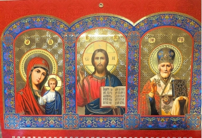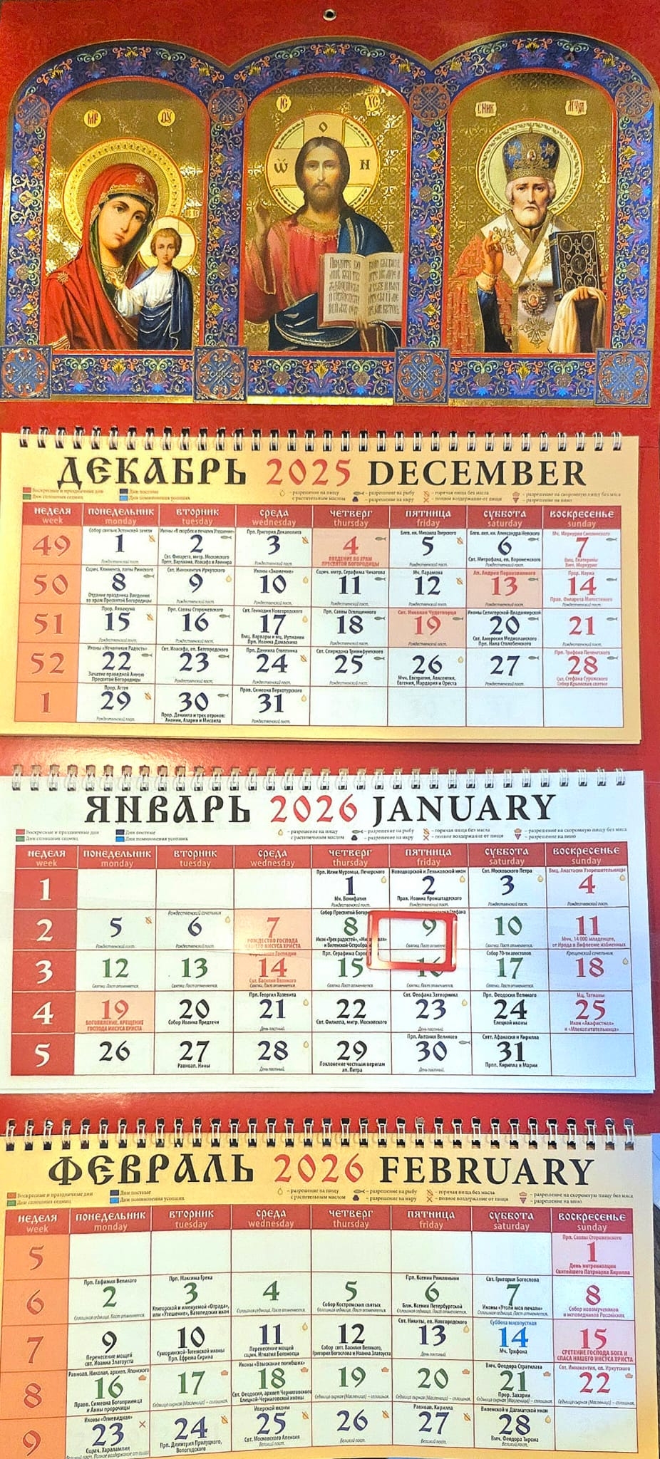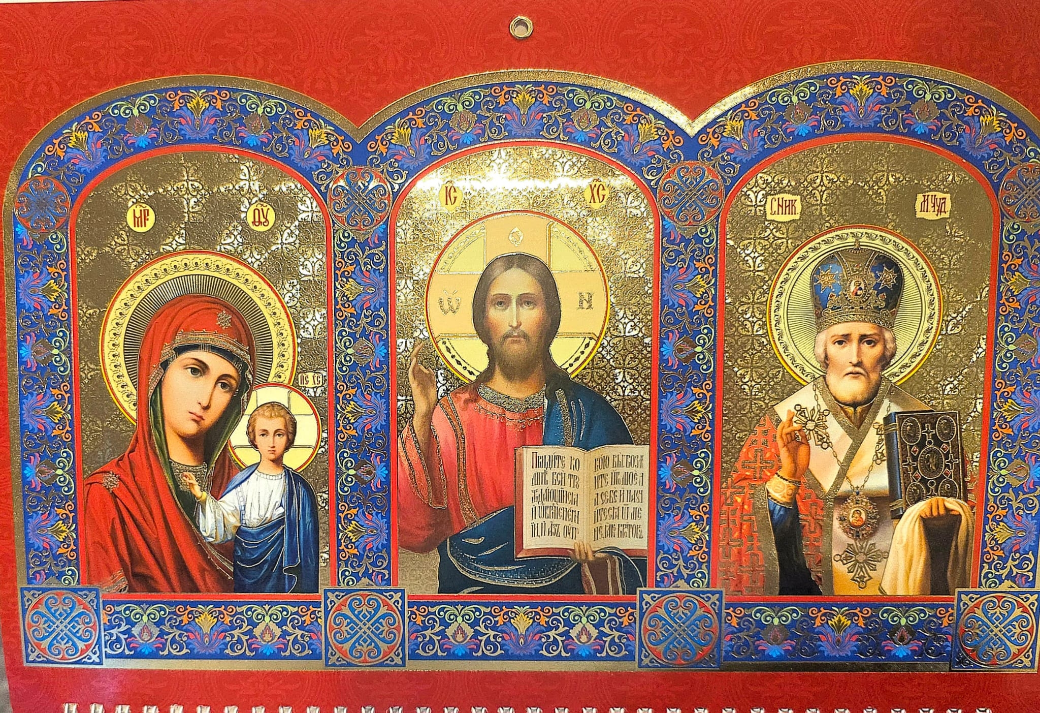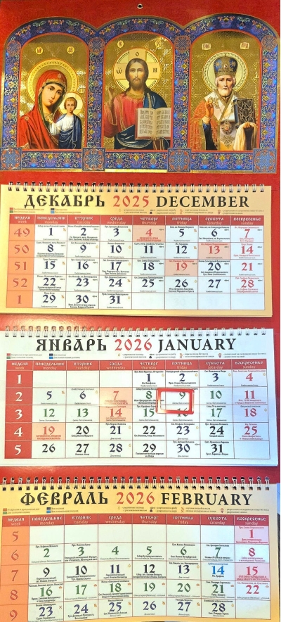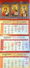 Icon of the Most Holy Theotokos "Kazan." Lord Almighty. Saint Nicholas the Wonderworker. Orthodox quarterly calendar with cursor for 2026.