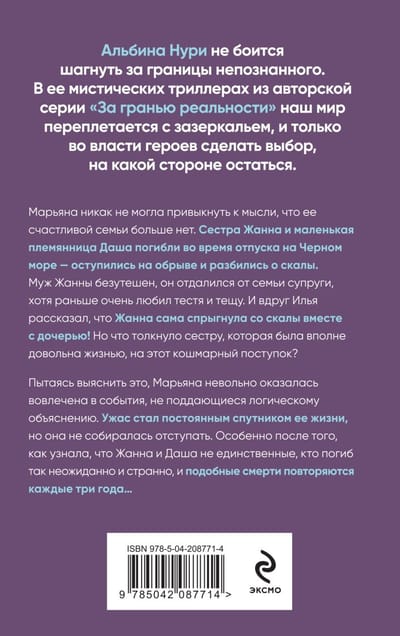 Maryana could not get used to the idea that her happy family was no more. Her sister Zhanna and little niece Dasha died during a vacation on the Black Sea - they tripped on a cliff and crashed into the rocks. Zhanna's husband was inconsolable, he distanced himself from his wife's family, although he used to love his father-in-law and mother-in-law very much. And suddenly Ilya told that Zhanna herself jumped off the cliff with her daughter! But what pushed her sister, who was quite happy with her life, to this terrible act? Trying to find out, Maryana involuntarily found herself involved in events that defied logical explanation. Horror became a constant companion of her life, but she was not going to retreat. Especially after she learned that Zhanna and Dasha were not the only ones who died so unexpectedly and strangely, and similar deaths are repeated every three years...