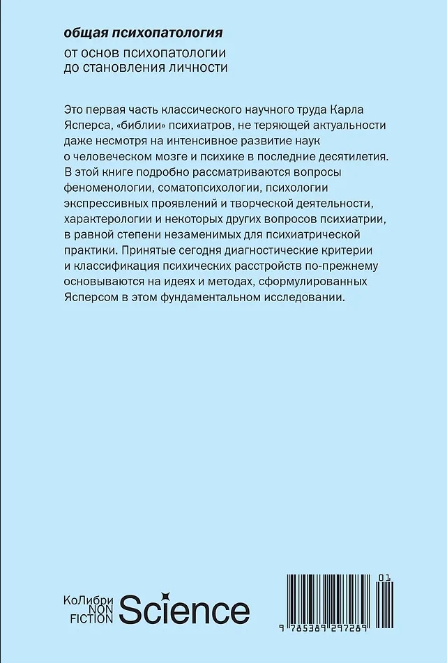 Karl Jaspers (1883–1969) is renowned primarily as a philosopher, one of the founders of existentialism, whose influence was noted by Albert Camus, Jean-Paul Sartre, and Hannah Arendt. However, Jaspers was not only a philosopher but also a psychiatrist, and his doctoral dissertation, General Psychopathology, was the result of several years of work in a psychiatric hospital. Jaspers was deeply dissatisfied with the approaches to the study and treatment of mental illness that existed at his time. He believed that this branch of medicine was in deep crisis, and set himself the ambitious task of developing a new scientific foundation for psychiatry. In fact, he created the philosophy of psychiatry, developing a new language and categorical apparatus for describing and classifying mental disorders. The first edition of General Psychopathology was published in 1913, when Jaspers was 30 years old; The book became his life's work, revising and expanding it with each edition, until 1959, when the 7th edition was published. It is a classic of psychiatric literature, a reference for psychiatrists, and remains indispensable despite the rapid advances in the sciences of the human brain and psyche in recent decades. The diagnostic criteria accepted today, as well as the classification of mental disorders, are still based on the ideas and methods outlined in this work.