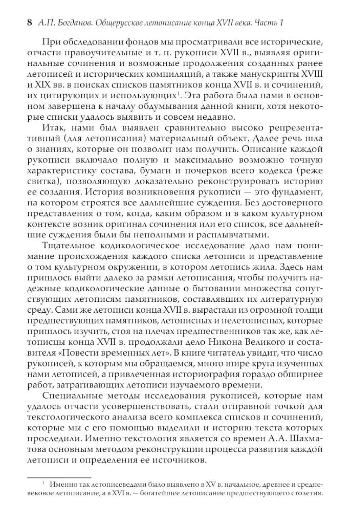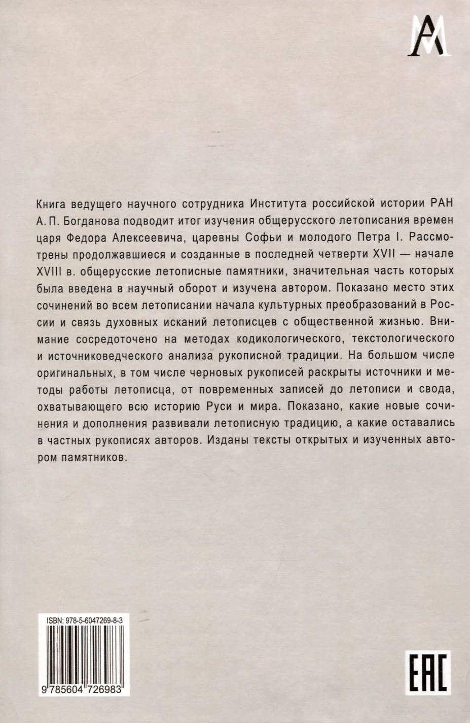 This book by A. P. Bogdanov, a leading researcher at the Institute of Russian History of the Russian Academy of Sciences, summarizes the study of all-Russian chronicle writing from the time of Tsar Feodor Alekseevich, Tsarevna Sophia, and the young Peter I. It examines all-Russian chronicle works, both those created and those continued in the last quarter of the 17th and early 18th centuries, many of which have been introduced into scholarly circulation and studied by the author. It explores the place of these works within the overall chronicle writing of the early cultural transformations in Russia and the connection between the chroniclers' spiritual quest and public life. Attention is focused on methods of codicological, textual, and source-study analysis of the manuscript tradition. A large number of original manuscripts, including drafts, reveal the chronicler's sources and methods, from period-by-period entries to a chronicle and a compilation encompassing the entire history of Rus' and the world. This book is intended for historians specializing in chronicles, archivists, and specialists in source studies and the history of Russian culture.
