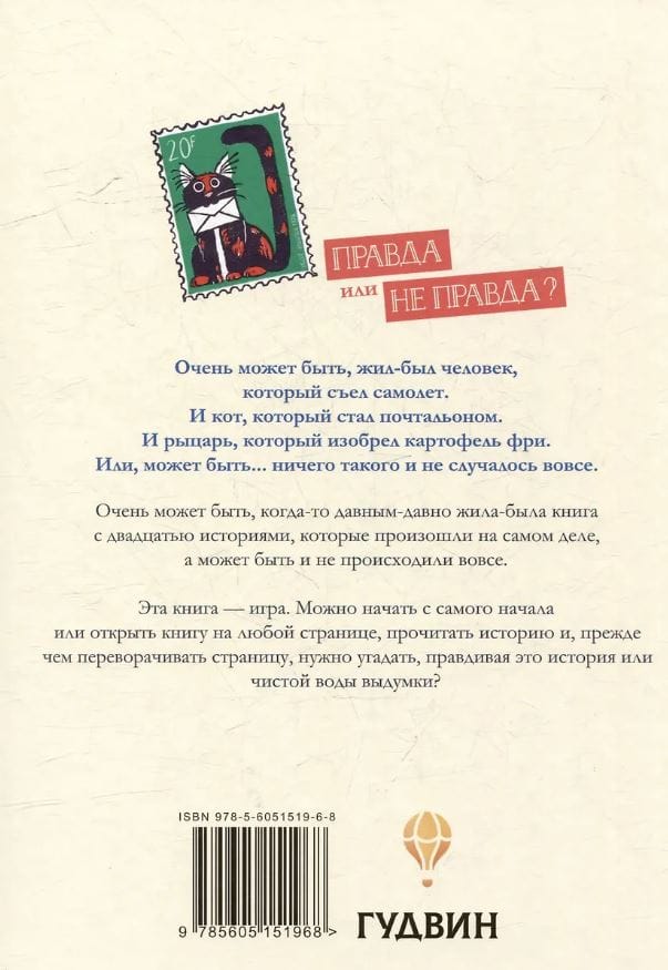 This book is a game. You can start from the beginning or open the book to any page, read the story, and before turning the page, you need to guess whether the story is true or pure fiction.