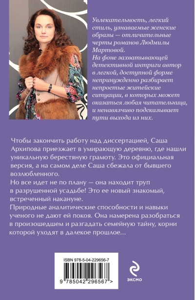 To finish her dissertation, Sasha Arkhipova travels to a dying village where a unique birch bark letter was discovered. This is the official story, but in reality, Sasha ran away from her ex-lover. But things don't go according to plan—she finds a corpse in the ruined estate! It's her new acquaintance, the one she met the day before. Her natural analytical skills and scholarly abilities haunt her. She's determined to get to the bottom of what happened and unravel a family secret whose roots reach deep into the past...