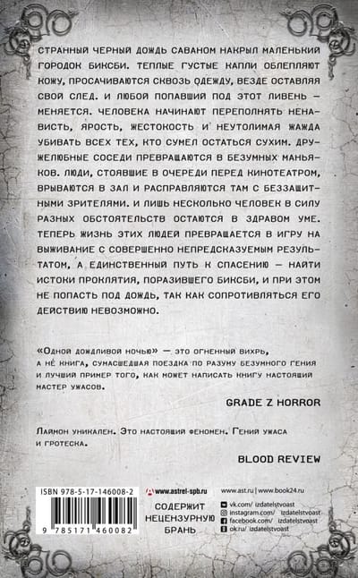 A strange black rain shrouded the small town of Bixby. Warm, thick drops cling to skin, seep through clothes, leaving their mark everywhere. And anyone caught in this downpour is changed. A man begins to overflow with hatred, rage, cruelty and an unquenchable thirst to kill all those who managed to stay dry. Friendly neighbors turn into crazed maniacs. People standing in line in front of the movie theater, burst into the hall and massacre defenseless spectators there. And only a few people due to different circumstances remain sane. Now the life of these people turns into a game of survival with a completely unpredictable result, and the only way to save themselves is to find the origins of the curse that affected Bixby, and at the same time do not get caught in the rain, as it is impossible to resist its effect.
