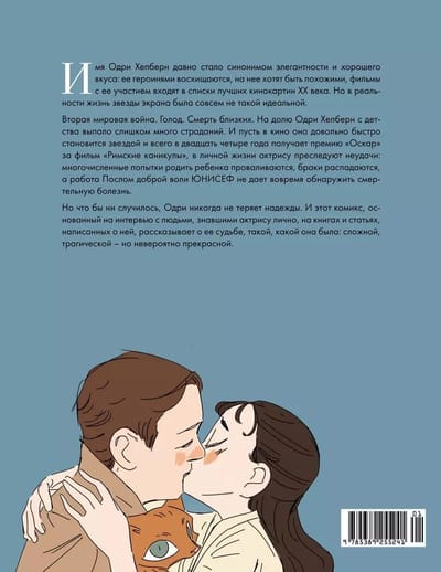 The name of Audrey Hepburn has long been synonymous with elegance and good taste: her heroines are admired, she wants to be like her, movies with her participation are included in lists of the best films of the XX century. But in reality, the life of the screen star was not so ideal. World War II. Famine. Death of loved ones. On the share of Audrey Hepburn from childhood fell too much suffering. And let the movie she quickly becomes a star and only twenty-four years old receives an Academy Award for the movie "Roman Holiday", in her personal life, the actress is haunted by failures: numerous attempts to give birth to a child failed, marriages break up, and the work of UNICEF Goodwill Ambassador does not give in time to detect a deadly disease. But no matter what happens, Audrey never gives up hope. And this comic book, based on interviews with people who knew the actress personally, on books and articles written about her, tells about her fate, as it was: complex, tragic - but incredibly beautiful.