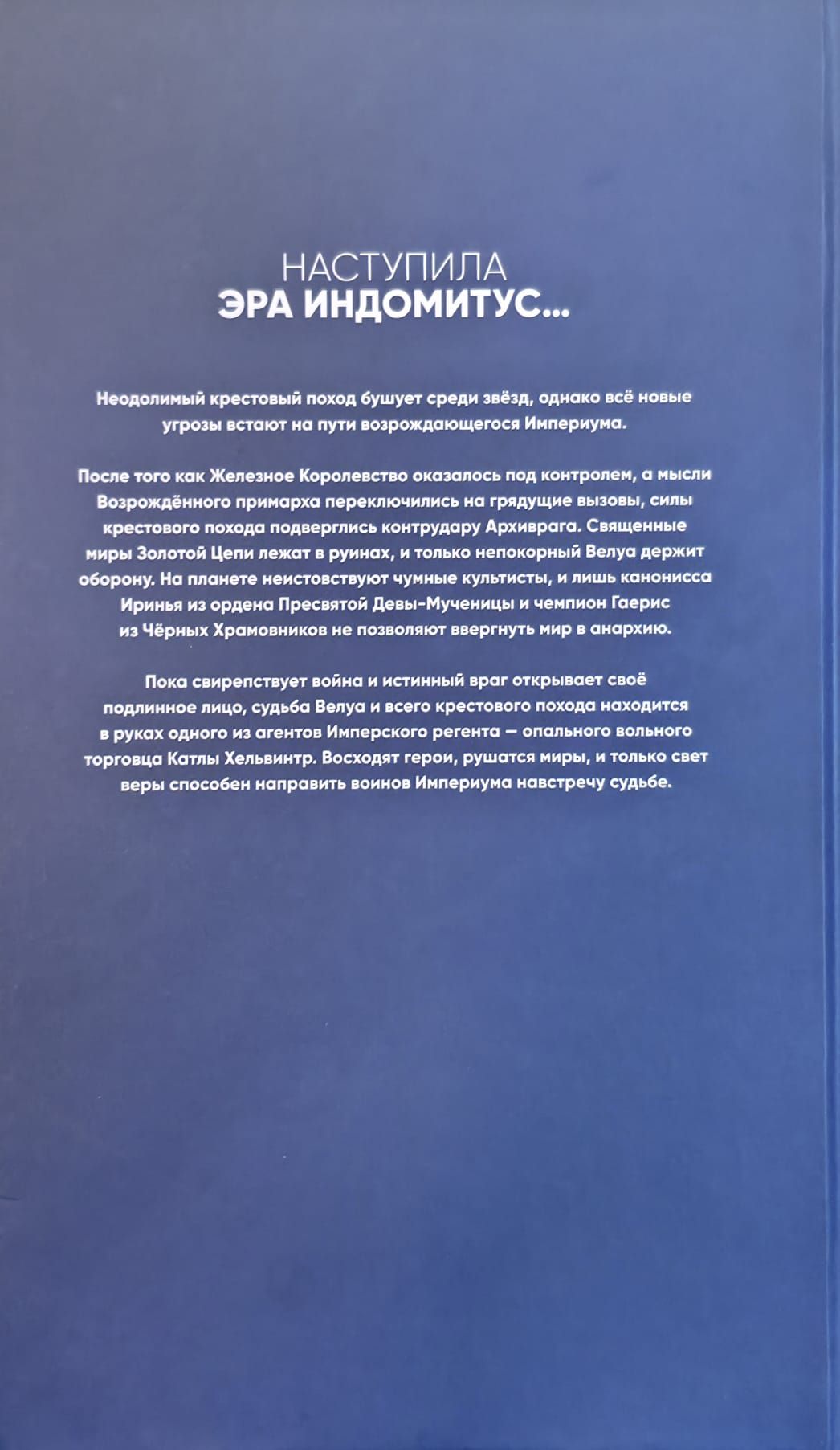 With the Iron Kingdom under control and the Primarch Reborn's thoughts turning to the challenges ahead, the Crusade forces are faced with a counterattack from the Archenemy. The sacred worlds of the Golden Chain lie in ruins, and only the defiant Velua holds the line. Plague cultists are rampaging across the planet, and only Canoness Irinya of the Order of Our Martyred Lady and Champion Gaeris of the Black Templars prevent the world from descending into anarchy.