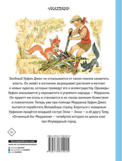 "The Fiery God of the Marrans" is the fourth fairy tale in A. Volkov's series about the Emerald City. The evil and resentful Urfin Jus continues to try to become the ruler of the entire Magic Land, this time with the help of the foolish and stubborn Marrans. Annie and Tim will help the inhabitants of the Magic Land defeat the treacherous Urfin. The book's illustrator, Leonid Vladimirsky, turns 100 in 2020. Author Alexander Volkov considered his illustrations to be the best.