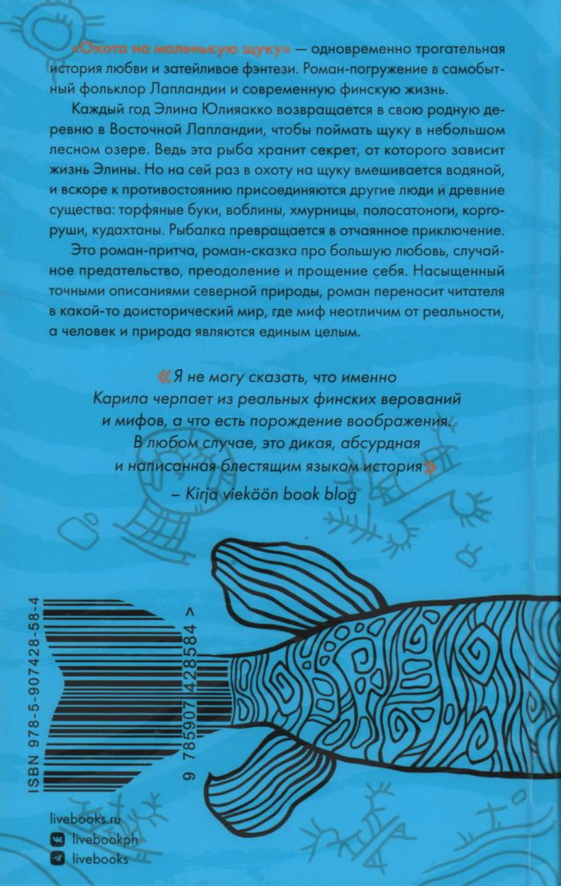"Little Pike Hunt" is both a touching love story and a whimsical fantasy. This immersive novel explores the unique folklore of Lapland and contemporary Finnish life. Every year, Elina Ylijakko returns to her home village in Eastern Lapland to catch pike in a small forest lake. After all, this fish holds a secret that could determine Elina's life. But this time, a water spirit interferes with the pike hunt, and soon other people and ancient creatures join the fray: peat beeches, wobblers, gloomy scaly-legged ... Filled with precise descriptions of northern nature, the novel transports the reader to a prehistoric world where myth is indistinguishable from reality, and man and nature are one.