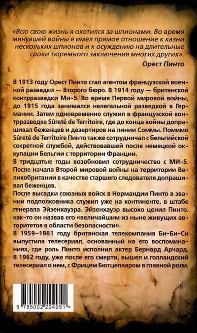 Orestes Pinto (1889-1961) was a prominent Dutch, British, Belgian and French counterintelligence and intelligence officer. He entered the secret service in 1913 and "retired" in 1949, when he completed his work of "filtering" the Dutch civilian population to identify German agents and collaborators. "The Spy Hunter" is a "textbook" for aspiring counterintelligence operatives, where the author candidly and in detail describes the intelligence and counterintelligence methods and techniques he used during World Wars I and II. Illustrating his story with numerous examples from his own practice. "Friend or Foe?" - The author's account of his service at the headquarters of the Dutch counterintelligence service in London in 1943-1944, when he was involved in screening refugees from Holland arriving in England.
