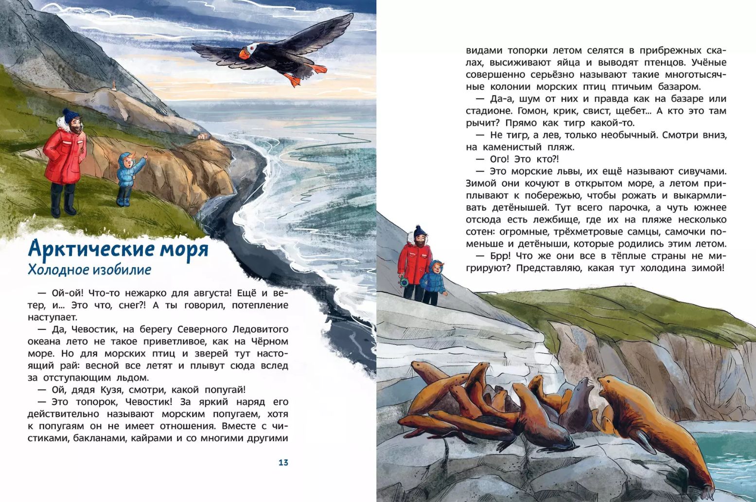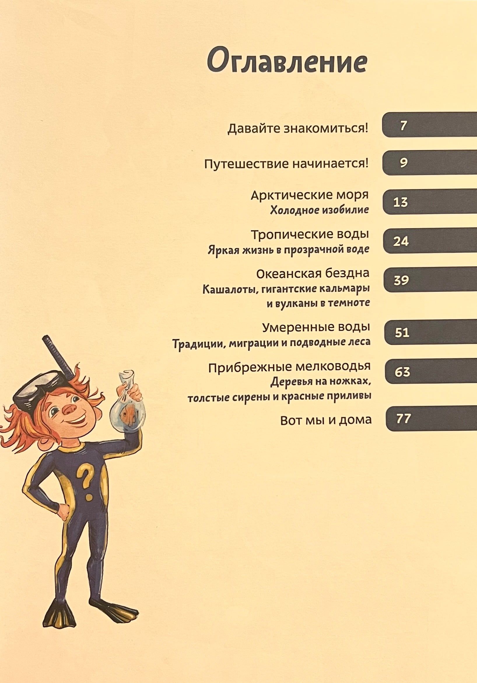Why is the water in the sea salty? Who lives in the dark depths of the ocean? Do fish drink water? Why are there high tides and low tides? Where does the mangrove forest grow and why do these trees have stilted roots? In the new encyclopedia, Chevostik and Uncle Kuzya will find answers to these and many other questions and go on a journey through the seas and oceans of the Earth. They will visit all climatic zones and see all the diversity of the marine world. Amazing animals, plants that are hard to imagine, mysterious inhabitants of the ocean depths, sea giants that seem to be living characters of legends are waiting for our heroes. Together with the heroes, readers will learn many facts that are hard to imagine, will be convinced that scientists have not yet found all the answers to the questions and the ocean can still be studied for a long time, and will make many interesting discoveries.