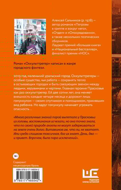 Salnikov's new novel "Occulttrager" is written in the genre of urban fantasy. The year is 2019, a small Ural town. Occulttregers - special beings whose job is to keep warm in cooling cities and be a link between humans, cherubs and devils. The main character Praskovya is precisely an occulttrager. She is two hundred years old, she changes her appearance every four months and cherishes only the homunculus - her companion and assistant who has taken the form of a child. But suddenly the homunculus begins to threaten....
