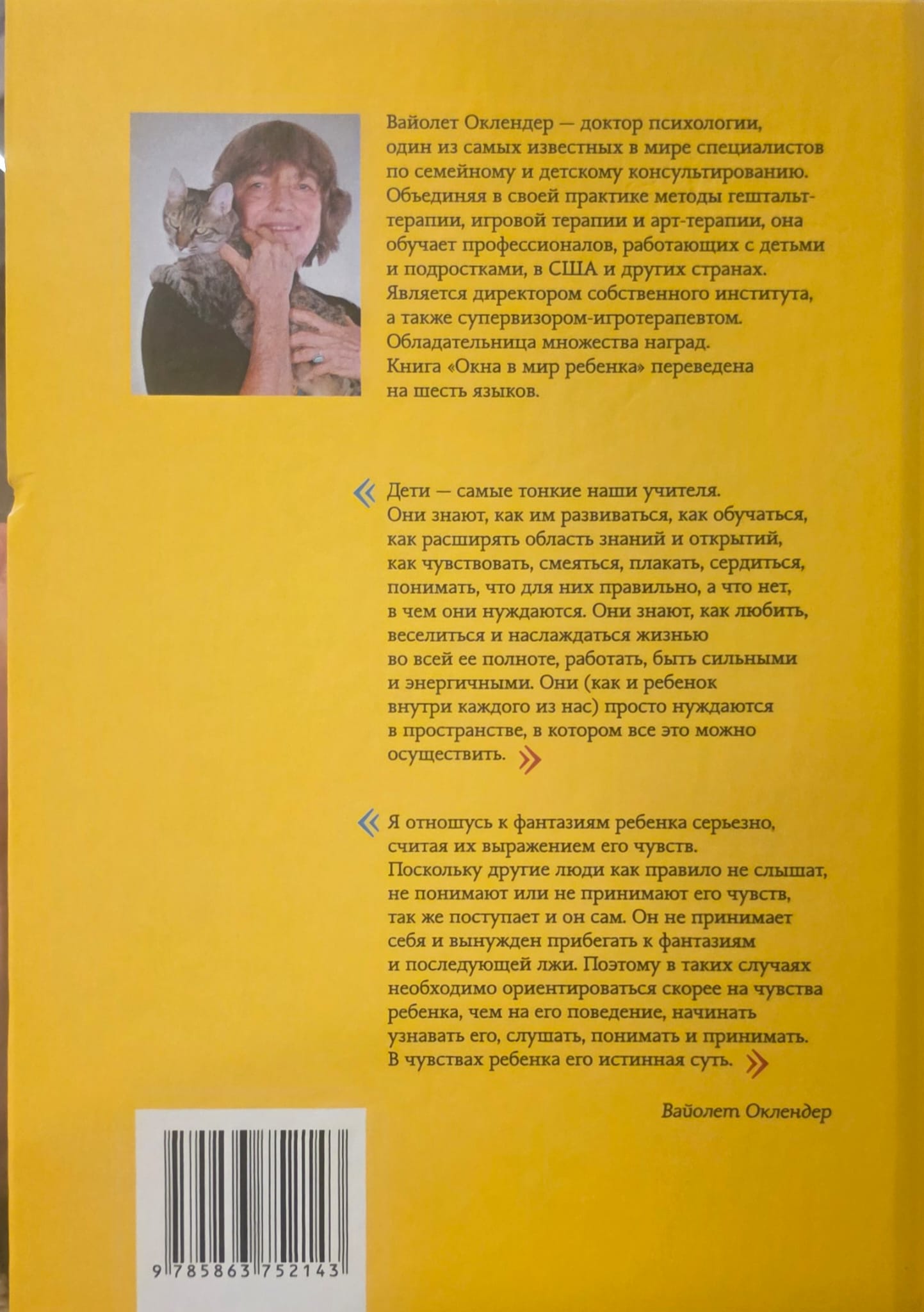 The book of the famous child psychotherapist Violet Oaklander is a subject of unquenchable interest, an effective assistant in work and life with children. Incredibly simple and logical in its comprehensive approach, Oaklander shows how to communicate with children so that they can fully and joyfully use their feelings, body, mind and openly express their emotions. The book describes in detail the work with typical problems and behaviors for children and adolescents, such as aggression, fear, hyperactivity, etc. Many activities are considered that give the opportunity to manifest the true emotions of the child. The experience of childhood sensations, kinesthetics, dreams, fantasies of the child is studied; relationships in the group, in the family, interaction with peers and adults are evaluated. The book is of interest to psychologists, psychotherapists, educators, teachers, parents, everyone who is interested in the psychology of the child and relations with children.