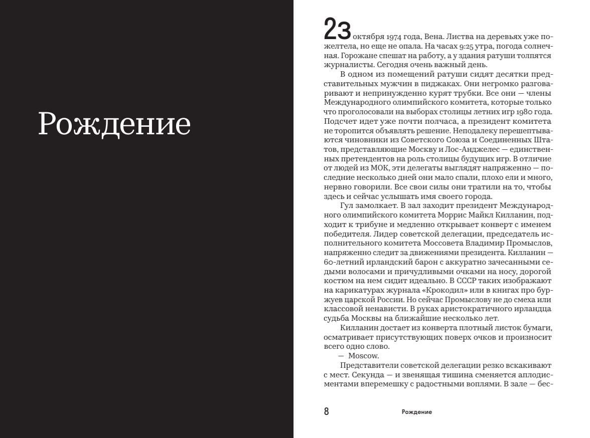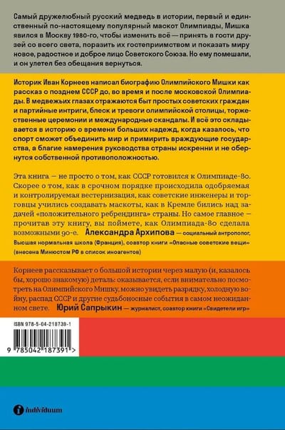 The friendliest Russian bear in history, the first and only truly popular Olympic mascot, Mishka came to Moscow in 1980 to change everything - to welcome friends from all over the world, to amaze them with his hospitality and to show the world a new, joyful and kind face of the Soviet Union. But he was thwarted, and he flew away without a promise to return. Historian Ivan Korneev wrote the biography of the Olympic Mishka as a story about the late USSR before, during and after the Moscow Olympics. The bear's eyes reflect the everyday life of ordinary Soviet citizens and party intrigues, the glitter and worries of the Olympic capital, the ceremonies and international scandals. And all this adds up to a story about a time of great hopes, when it seemed that sport could unite the world and reconcile warring states, and the good intentions of the country's leadership were sincere and would not turn into their opposite.