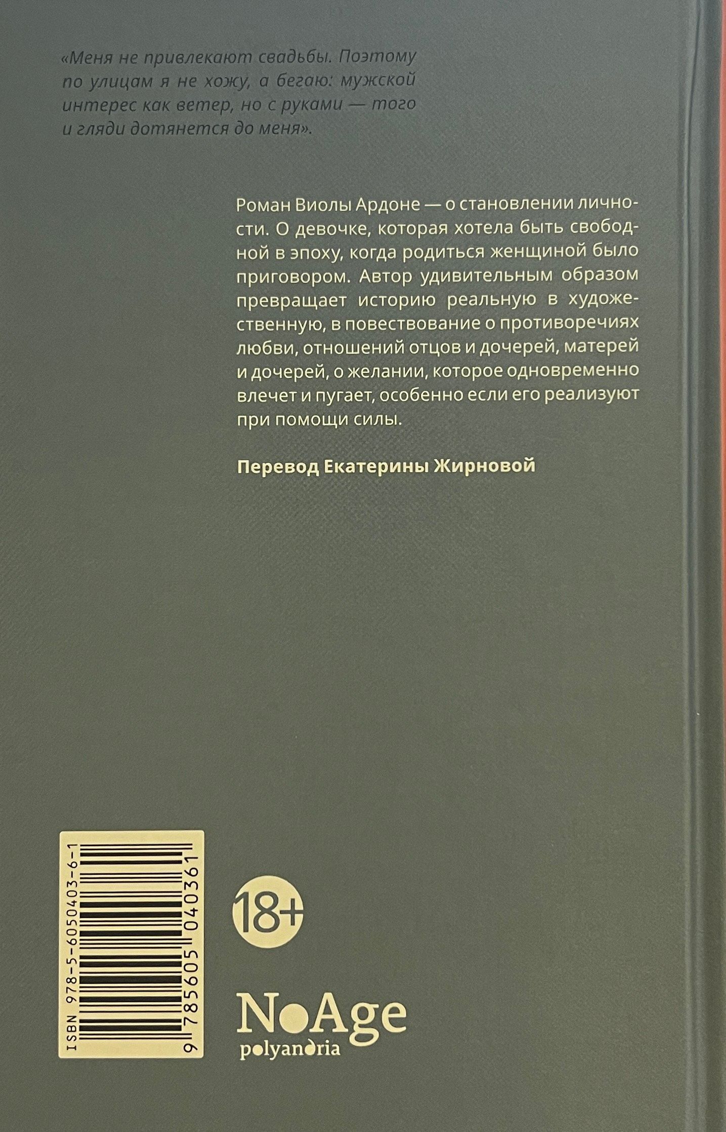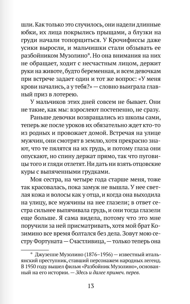 Viola Ardone's novel is about the formation of personality. About a girl who wanted to be free in an era when being born a woman was a sentence. The author surprisingly turns a real story into an artistic one, a story about the contradictions of love, the relationship between fathers and daughters, mothers and daughters, about desire, which is both attractive and frightening, especially if it is realized by force.