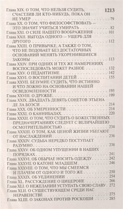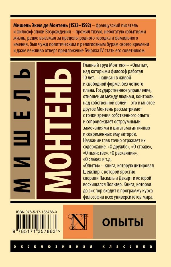 Montaigne's main work, the "Experiments", on which the philosopher worked for 10 years, is written in a lively and free form, without a clear plan. Public administration, relations between people, power over their own will - this and many other things the philosopher considers from the point of view of his own experience and accompanied by witty remarks and quotes from ancient and contemporary authors. The title of the chapters accurately reflects their content: "On Friendship", "On Fear", "On Drunkenness", "On Repentance", "On Glory", etc. "Experiments" is a book that was quoted by Shakespeare, argued vehemently with by Pascal and Descartes, and admired by Voltaire. A book that is still part of the philosophy course syllabus of every university in the world.