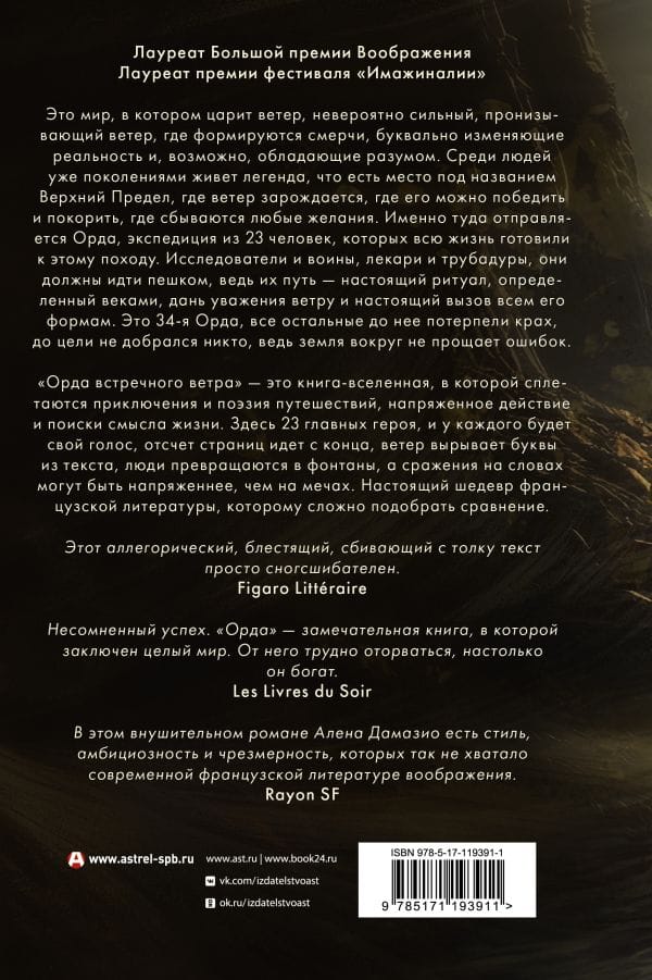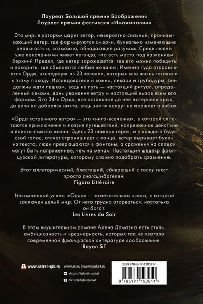 It is a world where the wind reigns, an incredibly strong, piercing wind, where tornadoes form, literally changing reality and possibly possessing intelligence. There is a legend that has lived among people for generations that there is a place called the Upper Limit, where the wind originates, where it can be defeated and conquered, where all wishes come true. That is where the Horde is going, an expedition of 23 men who have been prepared for this campaign all their lives. Explorers and warriors, healers and troubadours, they must go on foot, for their journey is a true ritual defined by centuries, a tribute to the wind and a true challenge to all its forms. This is the 34th Horde, all others before it have failed, no one has reached the goal, for the land around does not forgive mistakes. "The Horde of the Headwind" is a book-universe that weaves together adventure and travel poetry, suspenseful action and the search for the meaning of life. There are 23 main characters, and each will have his own voice, the countdown of pages goes from the end, the wind tears letters out of the text, people turn into fountains, and battles on words can be more tense than on swords. A true masterpiece of French literature, to which it is difficult to find a comparison.