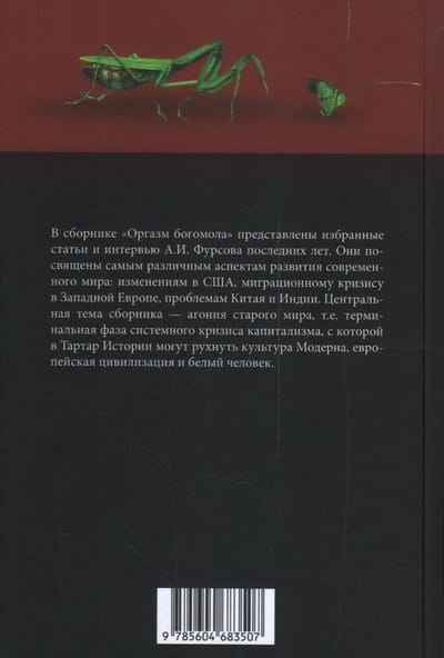 The collection "Mantis Orgasm" presents selected articles and interviews by A. I. Fursov of recent years. They are devoted to various aspects of the development of the modern world: changes in the United States, the migration crisis in Western Europe, the problems of China and India. The central theme of the collection is the agony of the old world, i.e. the terminal phase of the systemic crisis of capitalism, with which Modern culture, European civilization and the white man can collapse into the Tartarus of History.