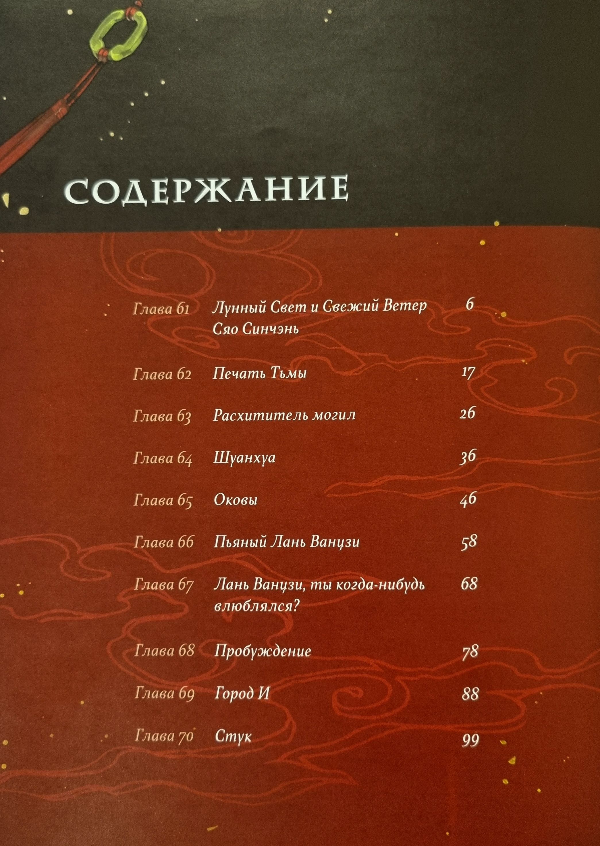 Whenever something happens in the perfect world, everyone is quick to blame Elder Yilin. It would seem that so many people are involved in the Chang Clan's tragedy... and they still think Wei Wuxian is the culprit. The fact is that long ago, he created a terrifying weapon: the Seal of Darkness. And to this day, the desire to possess it still drives many people to do crazy things. But Wei Wuxian does not despair. He is sure to find the truth even in such a confusing case! But first he will test the rules of the Lan clan once again, because it is not every day that the righteous Hanguang Jun can be persuaded to have a taste of wine. Meanwhile, a ghostly hand leads the heroes to the perishing lands, where they meet crowds of dead people and... very familiar young spellcasters. Wondering who else lurks in the thick fog of the sinister city of Yi?"