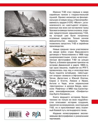 It was the T-62 that became the world's first mass-produced tank with a smoothbore gun. However, despite the phenomenal firepower and armor-piercing capability of the U-5TS Molot gun mounted on the Sixty-second, the military were trying their best to put "sticks in the wheels" of the Uralvagonzavod tank, preferring the Kharkov T-64, on which huge sums of money had already been spent. Only Marshal Chuikov's personal intervention allowed the T-62 to be put into serial production. The new medium tanks participated in the entry of the Warsaw Pact troops into Czechoslovakia in 1968 (numerous photos of T-62s on the streets of Prague became well known), and the baptism of fire took place on Damansky Island in March 1969, where one vehicle, hit by an RPG-7, fell through the ice and was subsequently recovered by the Chinese. "Sixty-second" fought in Afghanistan and Chechnya, Dagestan and South Ossetia, Syria and Egypt, Lebanon and Iraq, Angola and Chad, burned the Israeli "Centurions" in the Bekaa Valley, Iranian "Chiften" and M60 under Susengerd, South African "Olifants" under Kuito-Kanavale .... The book by the leading historian of armored vehicles not only describes in detail the history of creation, adoption for service, design of the T-62, but also traces the entire huge combat path of the legendary tank. The edition is illustrated with exclusive drawings.