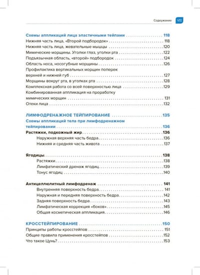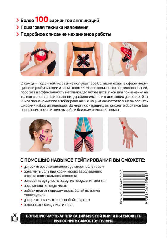 In this book you will find not only a detailed description of how to use taping, but also more than 100 application variants with step-by-step application techniques. A special place in the book is given to aesthetic facial and lymphatic (anti-cellulite) taping. Also a separate chapter in the book is devoted to cross-styping and application of cross tapes. accelerate recovery after traumas; relieve pain in periodic and chronic diseases of the musculoskeletal system (pain in the lower back, knee, shoulder, neck, etc.); correct stooping and others.); correct slouching and other posture disorders; restore muscle tone; get rid of periodic pain during menstruation; quickly relieve swelling with the help of tapes; effectively apply tapes for the face to get rid of wrinkles and improve skin condition; learn how to perform lymphatic drainage applications to combat excess weight, stretch marks and cellulite; learn how to fight headaches, insomnia, allergies and colds with the help of cross tapes.