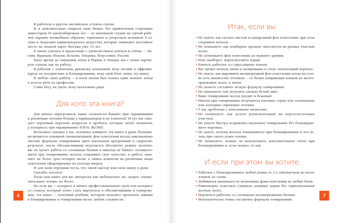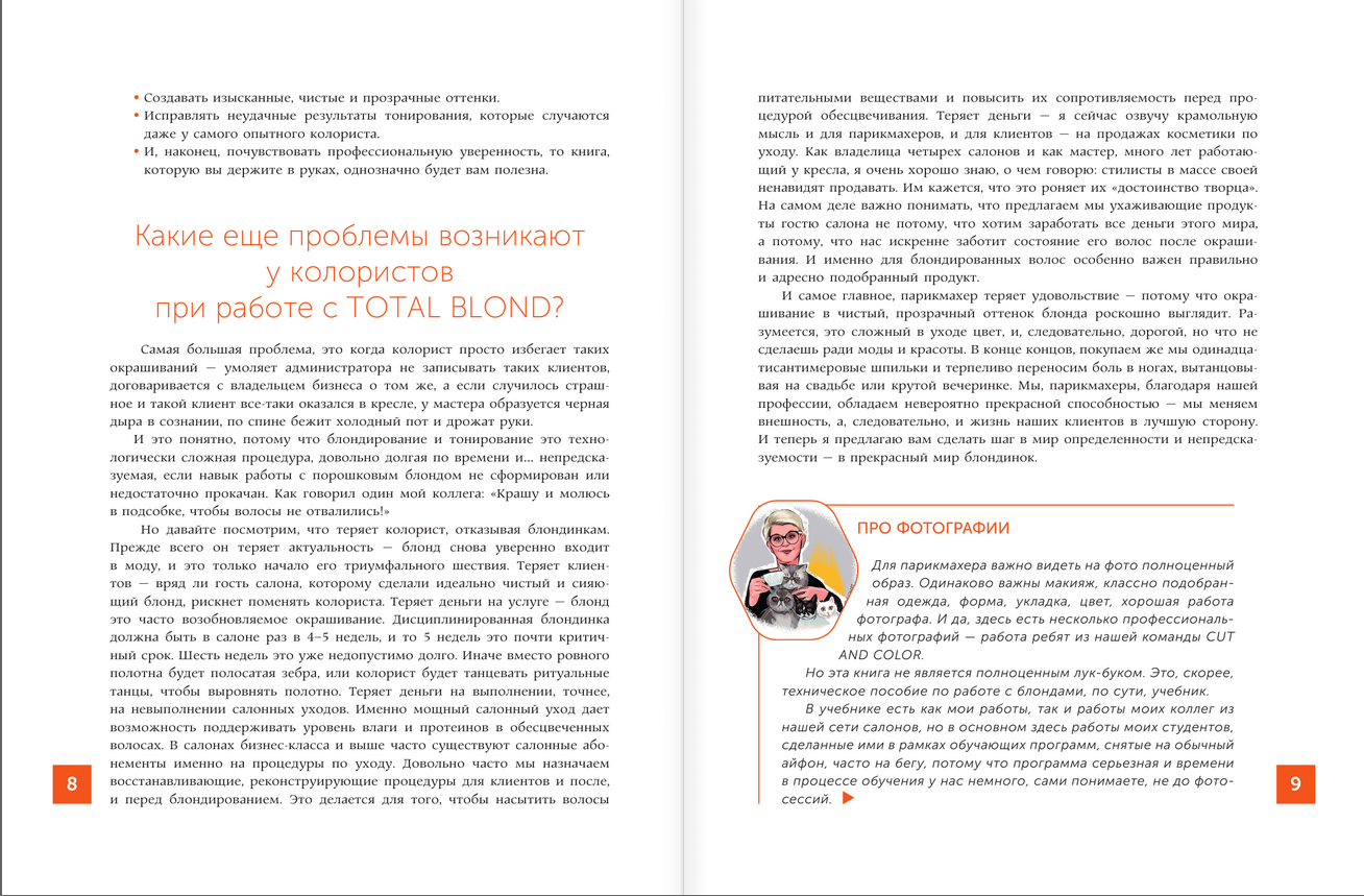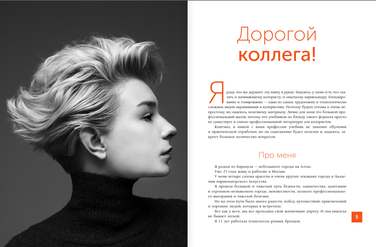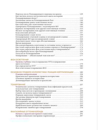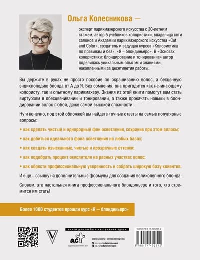Olga Kolesnikova, hairdressing expert with thirty years of experience, author of five coloring textbooks, owner of a chain of salons and the Academy of hairdressing "Cut and Color", creator and presenter of the courses "Coloring by the rules and without", "I am a blondiniero". In your hands is not just a book, but a unique encyclopedia of blond - from A to Z, which will suit both a novice colorist and an experienced hairdresser. A desk book for professional blondiniero! Knowledge from this book will help you become a virtuoso in bleaching and toning, as well as pump up your skills in blonding hair of any complexity. Well, and of course, under this cover you will find the exact answers to the questions: - How to make a clean and homogeneous background of lightening, while preserving the hair; - How to choose the percentage of oxidizer on different parts of the hair; - How to achieve the ideal of possible background lightening on any bases; - How to create exquisite, clean and transparent shades; - How to gain professional confidence and collect a wide base of clients.