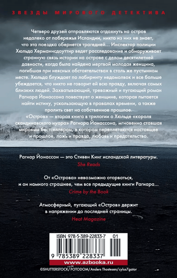 Four friends go on vacation to an island off the coast of Iceland, none of them knowing that the trip will turn tragic... Police Inspector Hulda Hermannsdóttir investigates and discovers a strange connection between the story on the island and a case from ten years ago, when a young woman was found dead, killed under unclear circumstances in a similarly desolate place. Hulda wanders through a maze of innuendo and becomes increasingly convinced that no one is telling her the whole truth, including those closest to her. Ragnar Jonasson's gripping, disturbing and frightening novel tells the story of a woman trying to find the truth that eludes her in the lapses of time, as well as shedding light on her own past. "Island" - the second book in the trilogy about Hulda "king of Scandinavian noir" Ragnar Jonasson, instantly became a world bestseller, in which the present and the past, lies and truth, love and betrayal intertwine.