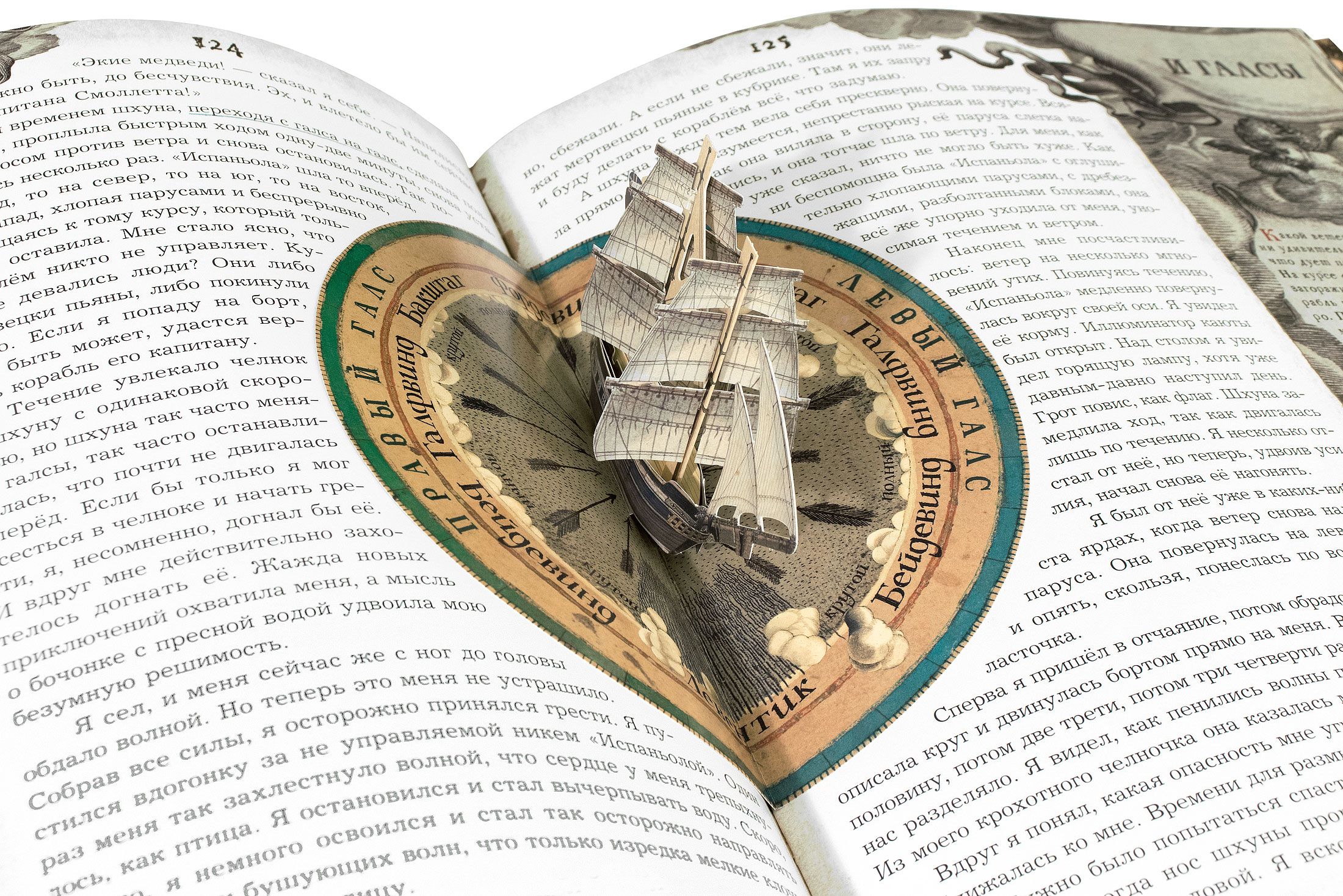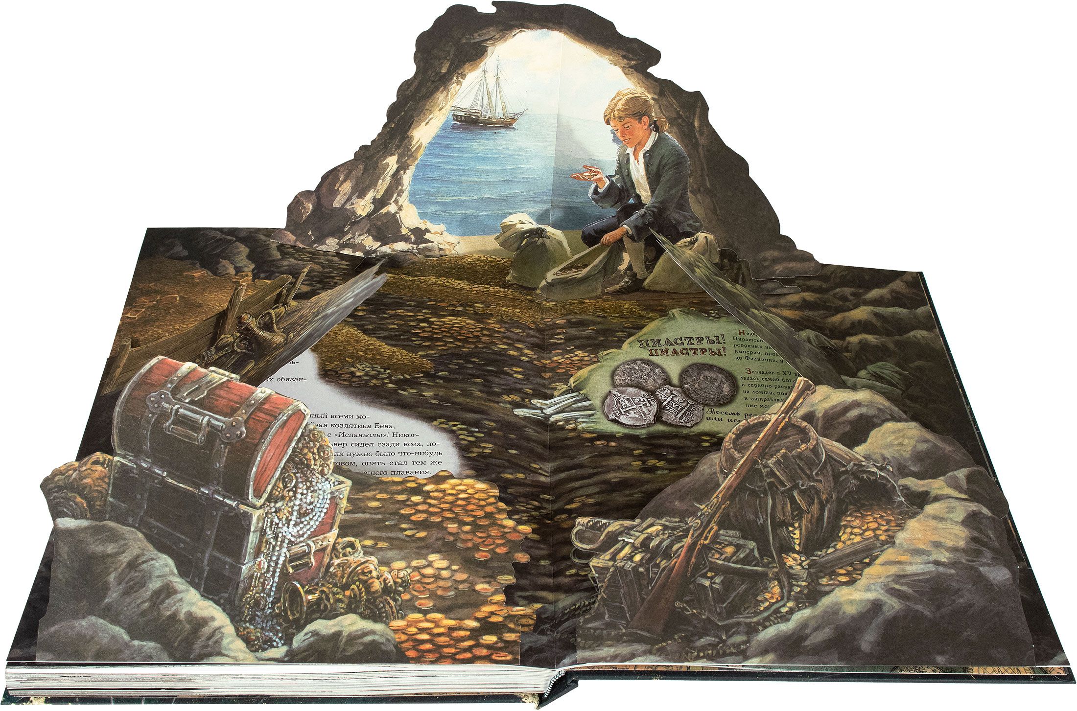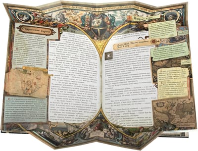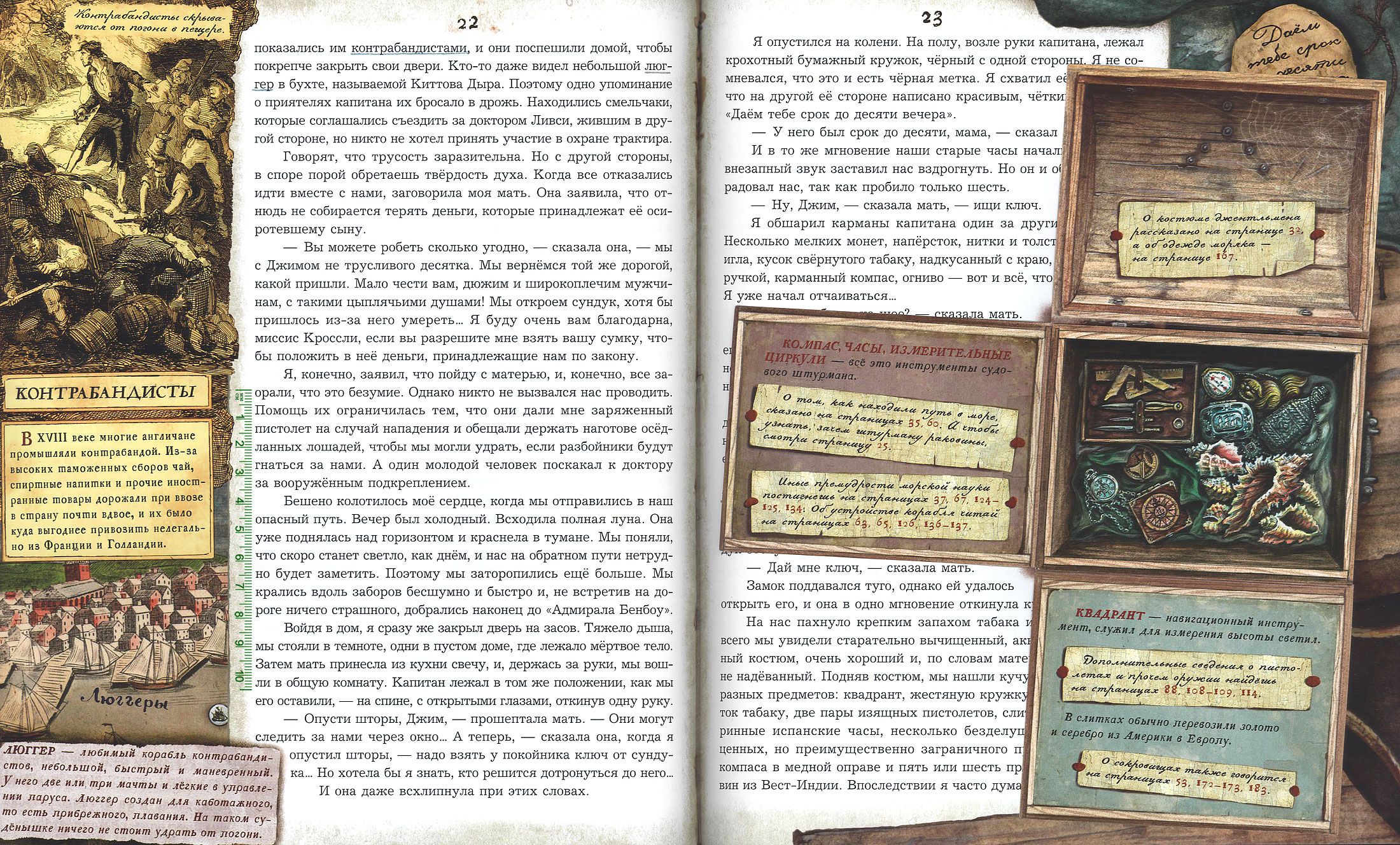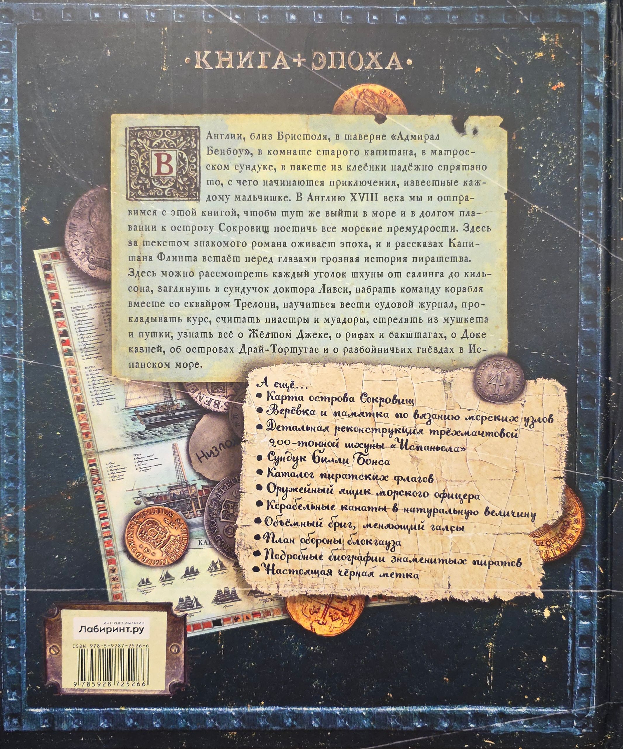 In England, near Bristol, in the Admiral Benbow tavern, in the old captain's room, in a sailor's chest, in an oilcloth bag, lies the beginning of an adventure familiar to every boy. This book takes us to 18th-century England, where we can immediately set sail and master all the intricacies of the sea on a long voyage to Treasure Island. Here, the era comes alive behind the text of a familiar novel, and Captain Flint's tales reveal the formidable history of piracy. Here you can examine every corner of the schooner, from the cross-mast to the keelson, peer into Dr. Livesey's chest, recruit a ship's crew with Squire Trelawney, learn how to keep a log, plot a course, count piastres and muadors, fire a musket and cannon, learn all about Yellow Jack, reefs and backstays, Execution Dock, the Dry Tortugas Islands, and the pirate nests of the Spanish Sea.