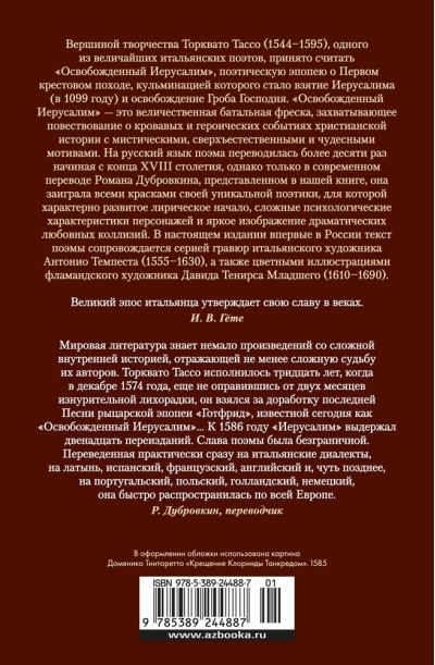 The pinnacle of the work of Torquato Tasso (1544-1595), one of the greatest Italian poets, is considered to be "Jerusalem Liberated", a poetic epic about the First Crusade, which culminated in the capture of Jerusalem (in 1099) and the liberation of the Holy Sepulchre. "Liberated Jerusalem" is a battle fresco, a gripping narrative of the bloody and heroic events of Christian history with mystical, supernatural and miraculous motifs. The poem has been translated into Russian more than ten times since the end of the XVIII century, but only in the modern translation by Roman Dubrovkin, presented in our book, it has played with all the colors of its unique poetics, which is characterized by a developed lyrical beginning, complex psychological characteristics of characters and vivid depiction of dramatic love collisions. In this edition, for the first time, the text of the poem is accompanied by a series of engravings by the Italian artist Antonio Tempesta (1555-1630), as well as color illustrations by the Flemish artist David Teniers the Younger (1610-1690).