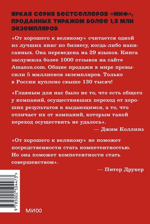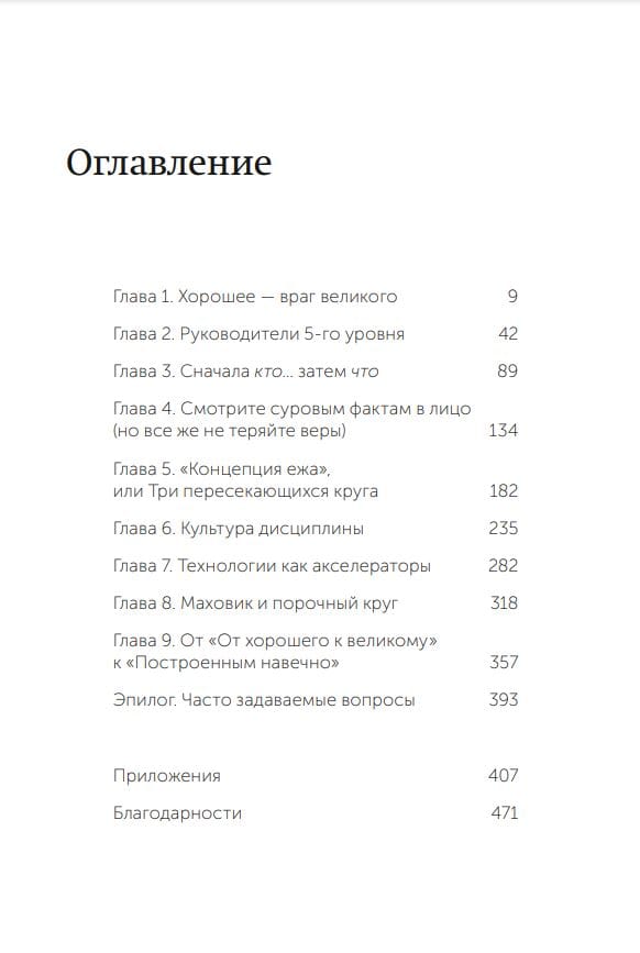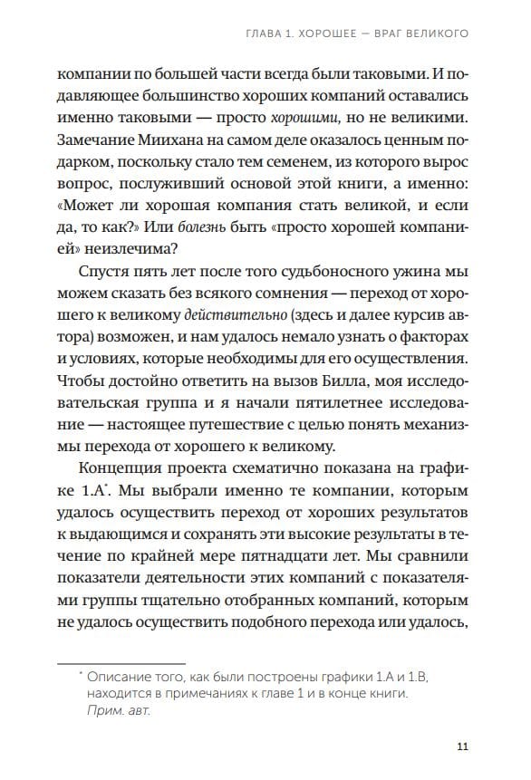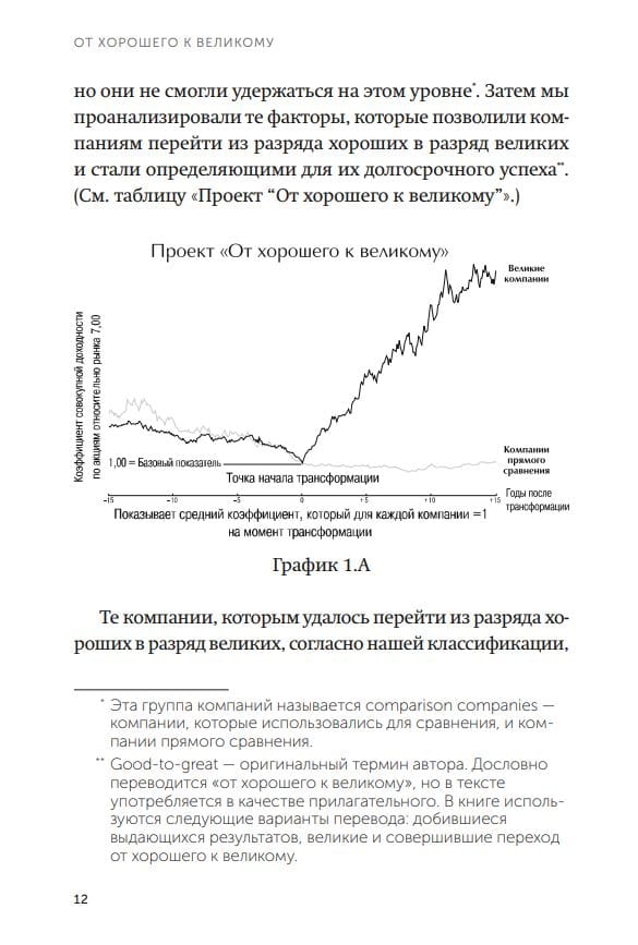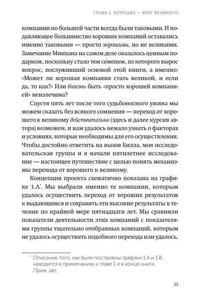 The book analyzes the experience of companies that have made the transition from good to outstanding, such as: Abbott, Circuit City, Fannie Mae, Gillette, Kimberly-Clark, Kroger, Nucor, Philip Morris, Pitney Bowes, Walgreens, Wells Fargo. These companies maintained high results for 15 years. Thus, by 2000, an investment of $ 1 made in 1965 in these companies would have increased 471 times, and investments in shares of all companies on the market would have increased only 56 times. The research team led by Jim Collins examines the factors and conditions necessary for the transition "from good to great" and its mechanisms. The authors are convinced that consistent implementation of the ideas and concepts outlined in the book will help almost any organization radically improve its activities and achieve truly outstanding results.