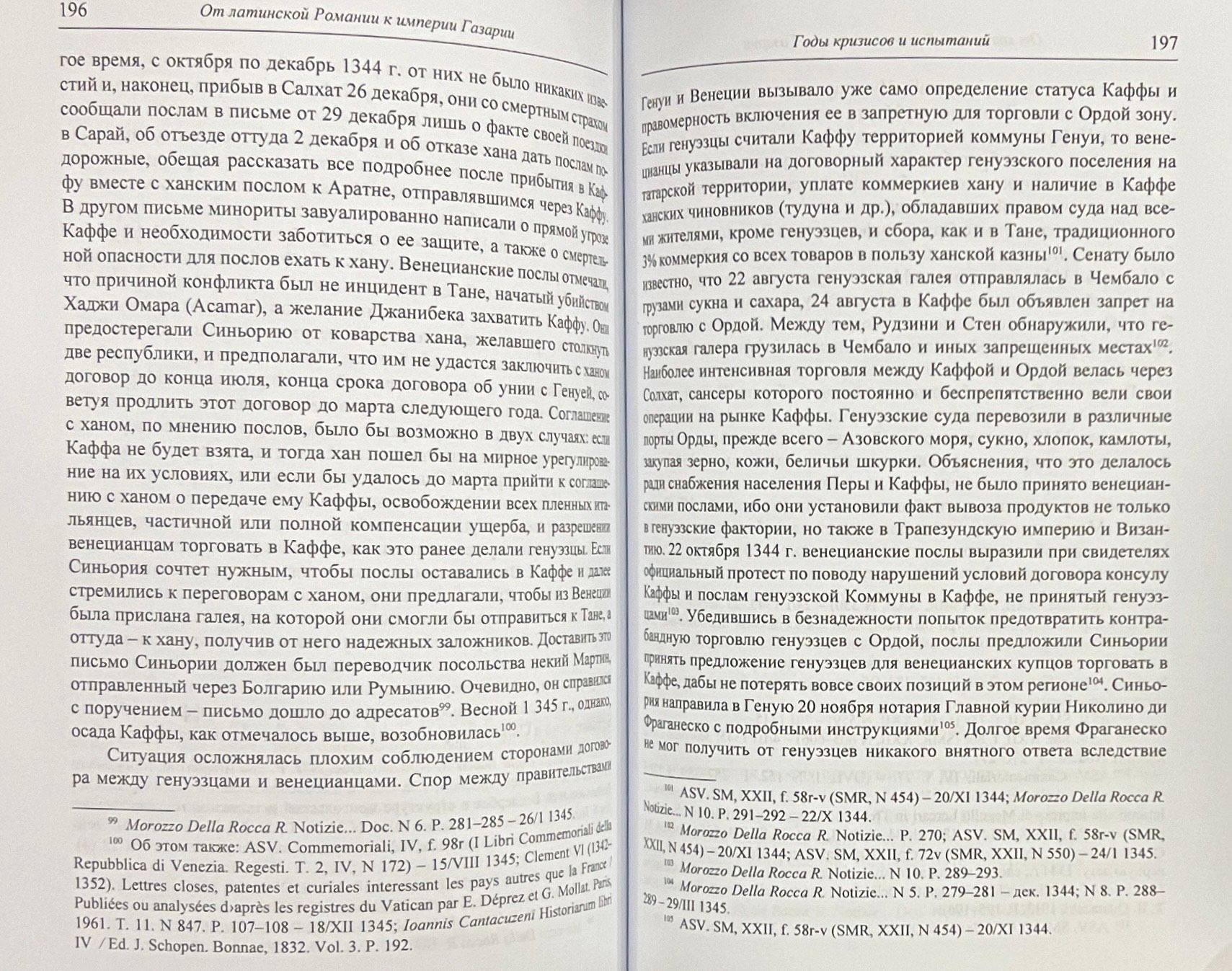 The book by the famous Russian medievalist and Byzantinist S. P. Karpov contains his research on the history of the Italian trading posts of the Black Sea region and the Golden Horde and is a logical continuation of his collection of works "Latin Romania". It comprehensively examines the methods of colonization of Genoa and Venice in the Crimea and the Azov region, the practice of judicial regulation of legal relations in trading posts, the status of Italian settlements on the territory of the Golden Horde. Based on newly discovered sources from Italian archives, the author studies the history of diplomatic relations, crises and conflicts that affected the territories of the Golden Horde, Anatolia and Georgia. Emphasis is placed on the transformation of the priorities of trade and politics of the Italian maritime republics, which were increasingly integrated into the complex and contradictory world of the Horde realities. The ethno-demographic problems, life and customs of the Italian trading posts of the Black Sea region are also studied, primarily based on materials related to the history of Tana (Azov) in the 14th-15th centuries.