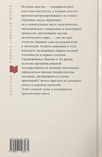 The history of the papacy - a specific power institution that for a long time controlled not only huge masses of believers, but also a significant part of political, economic, social and cultural processes within the Catholic world - has occupied the minds of researchers and readers for centuries. The period of late Antiquity and the first centuries of the Middle Ages deserve special attention in this context. It was at this time, on the wave of the collapse of Roman statehood, that the papal theocratic doctrine began to gradually take shape, laying the foundations of the Holy See's claims to spiritual authority on a global scale. This book is dedicated to this complex epoch.